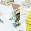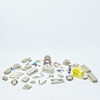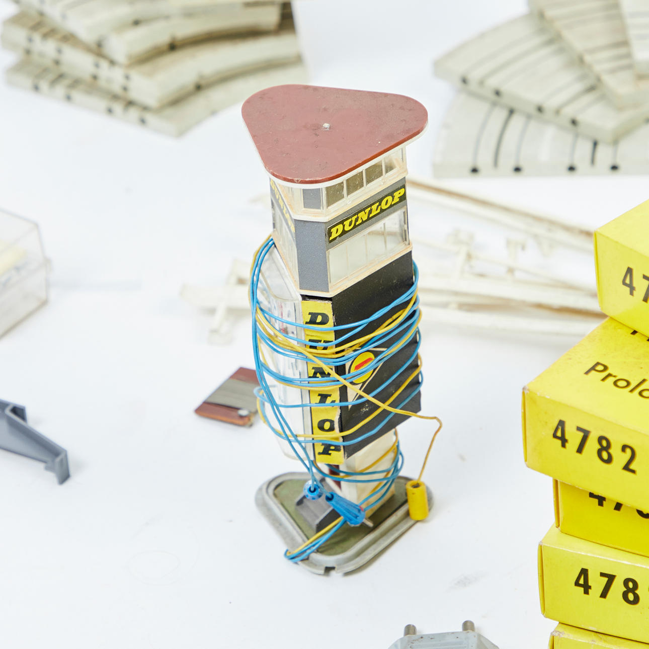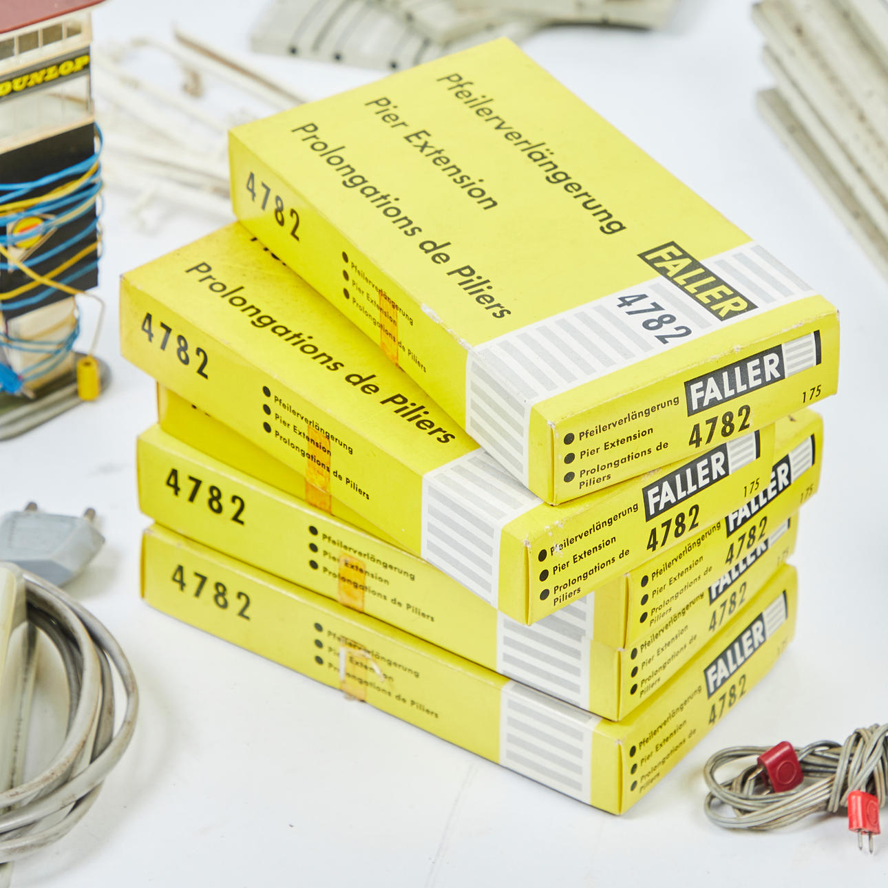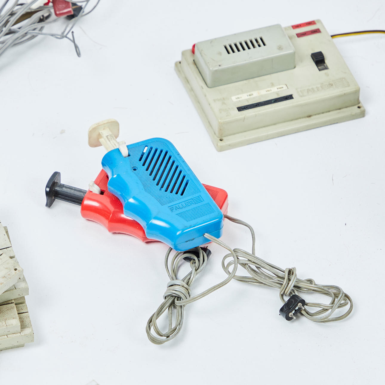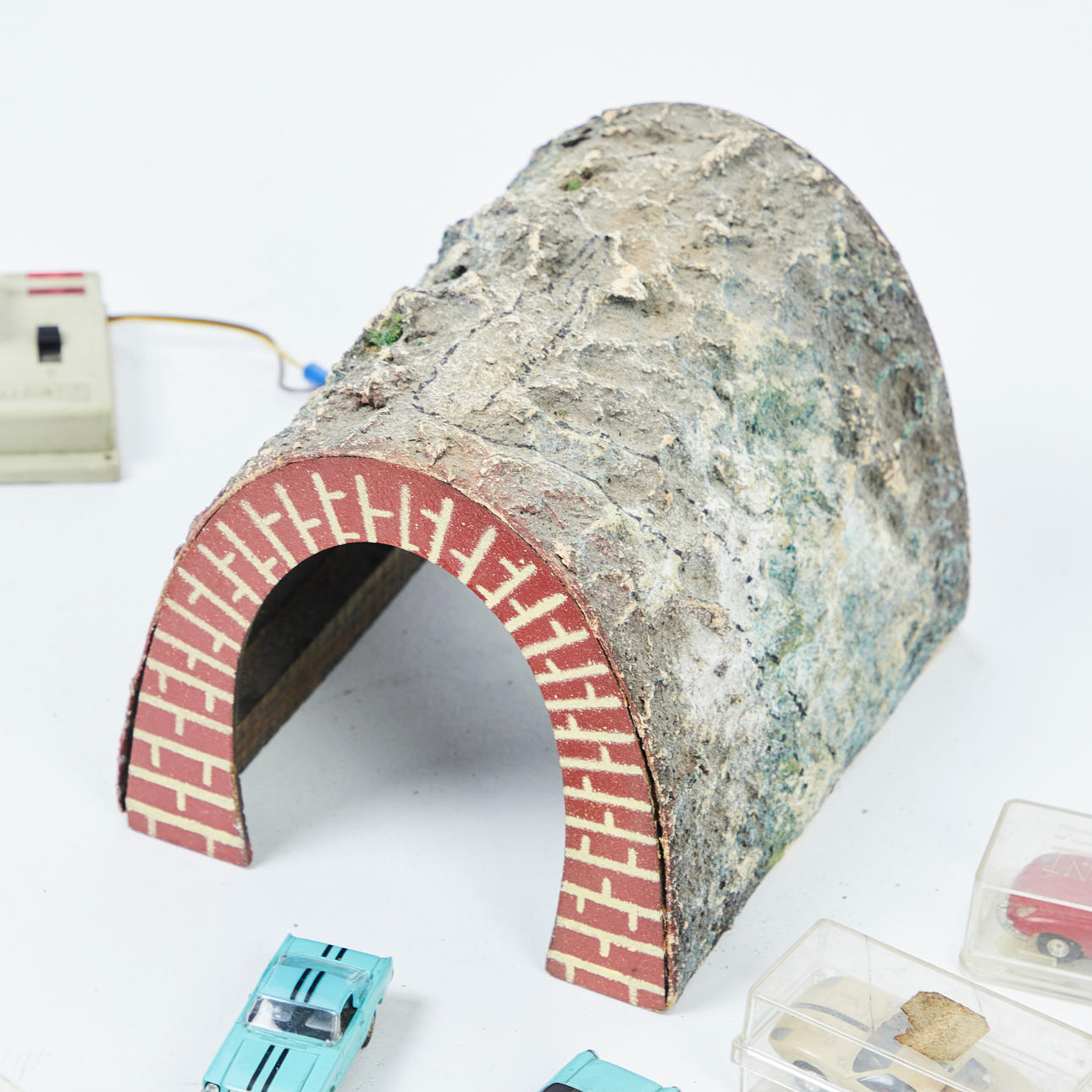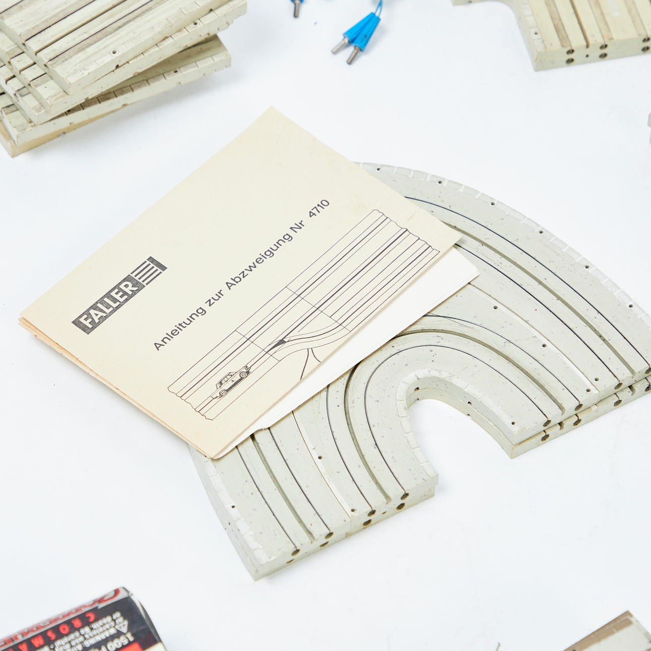 Faller AMS, Autorennbahn mit Autos, 1960, Deutschland. Konvolut bestehend aus diversen Schienenteilen aus Kunststoff zum konstruieren einer Rennstrecke, zwei Kontrollern, sieben Autos, einer Zapfsäule und einem Tunnel, anbei Werkzeug und Schrauben zum zusammenbauen, diverse Teile mit dem Herstellerlogo versehen, H.40cm, L.30cm, B.30cm.
