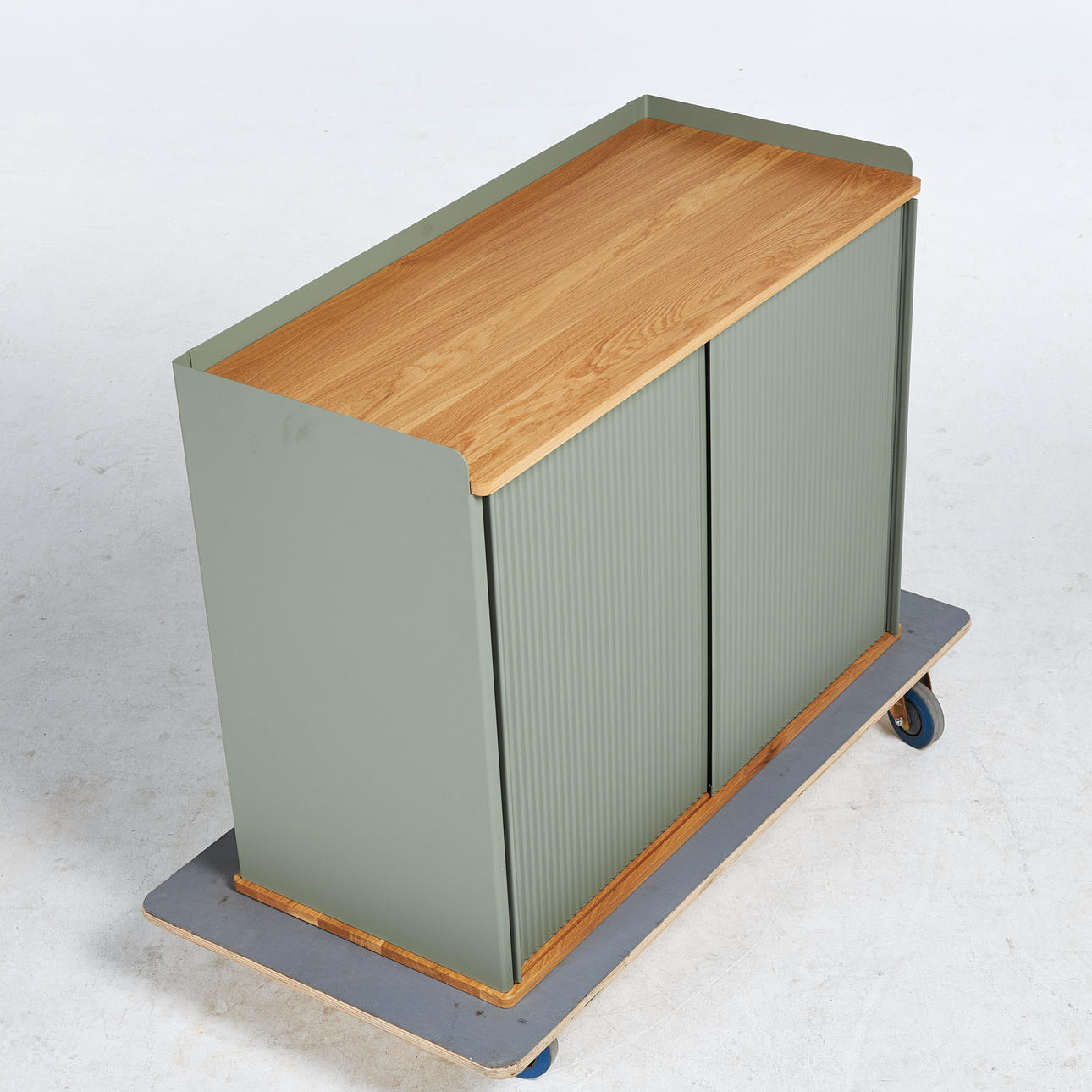 3122353. THOMAS BENTZEN, ein Beistelltisch, „Enfold Sideboard Pine“, massive Eiche, pulverbeschichteter Stahl, grün lackiert, Muuto, zeitgenössisch.