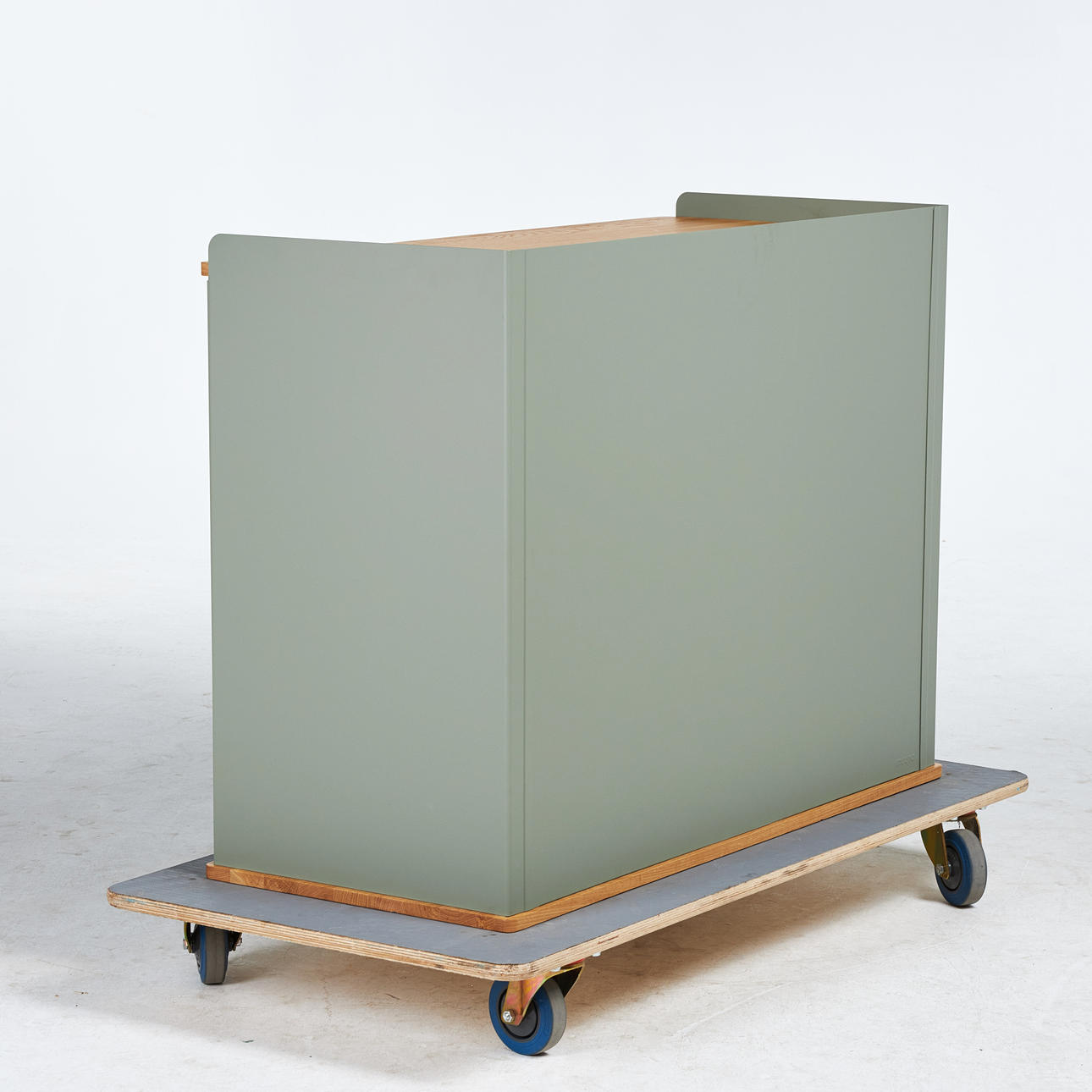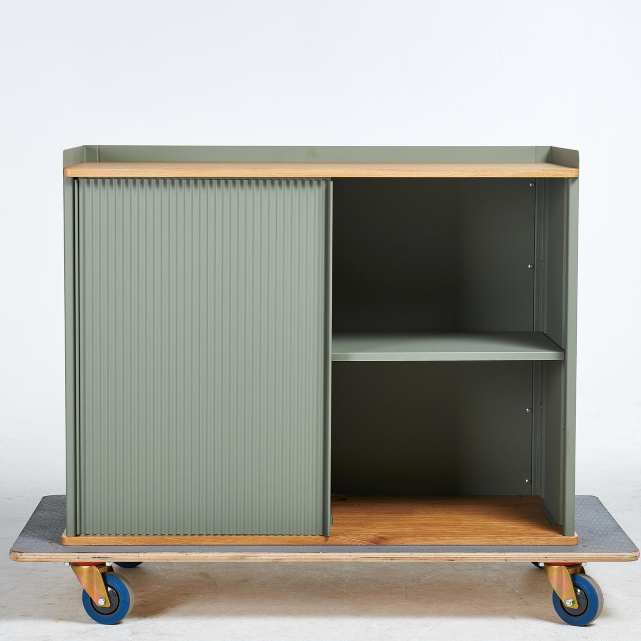THOMAS BENTZEN, ein Beistelltisch, „Enfold Sideboard Pine“, massive Eiche, pulverbeschichteter Stahl, grün lackiert, Muuto, zeitgenössisch.