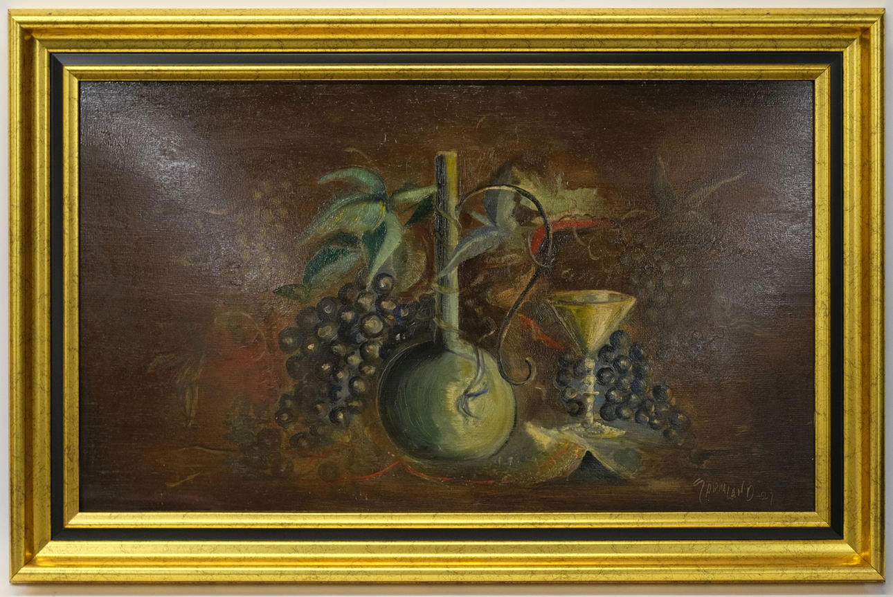 Unbekannter kûnstler. Öl auf Tafel. Stillleben mit Trauben und Glas. Signiert und datiert '21. Bildmaße: ca. 45 x 79 cm. Maße des Rahmens: ca. 61 x 93,5 cm