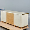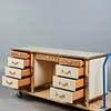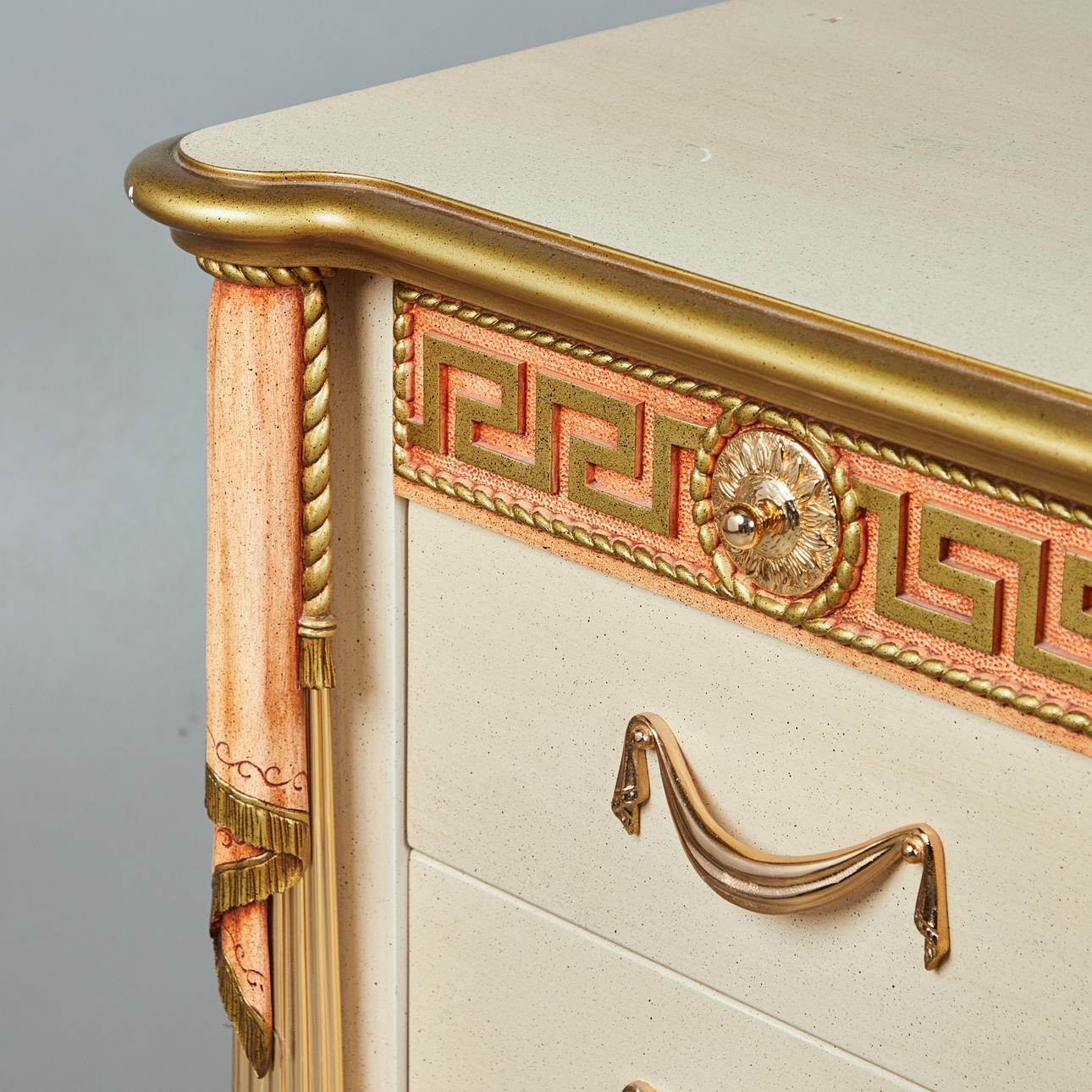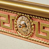 Schreibtisch / Tisch, Holz, Metall. Schreibtisch mit einem Gestell aus beigefarbenem und roséfarben gefasstem Holz mit sechs Schüben, vorderseitig mit einer Bordüre mit goldfarbenen, floralen Metallornamenten ausgestattet, Schübe jeweils von zwei kannelierten Säulen flankiert, H.75cm, L.178cm, B.58cm.