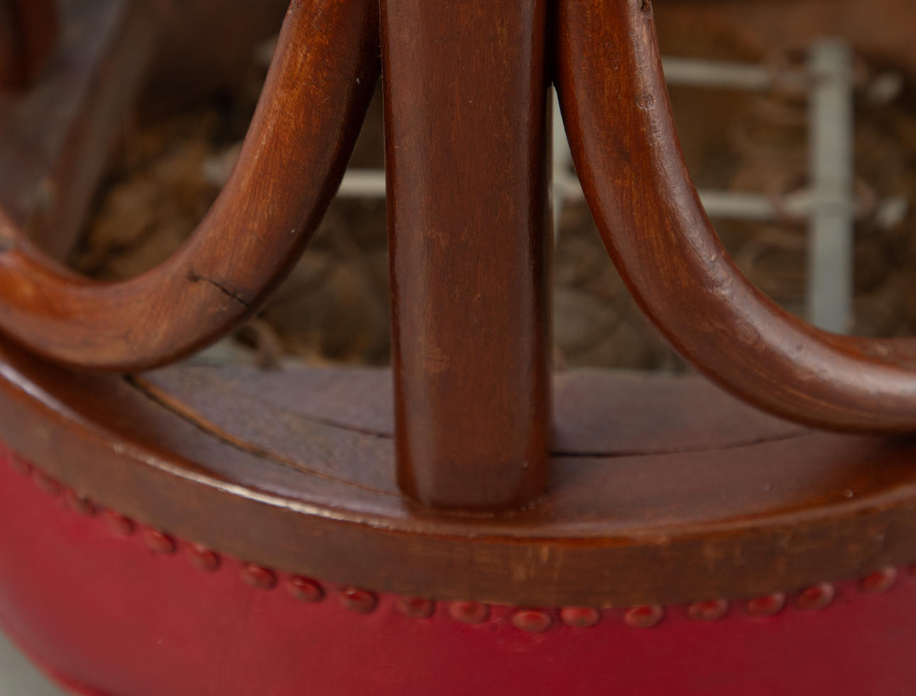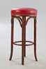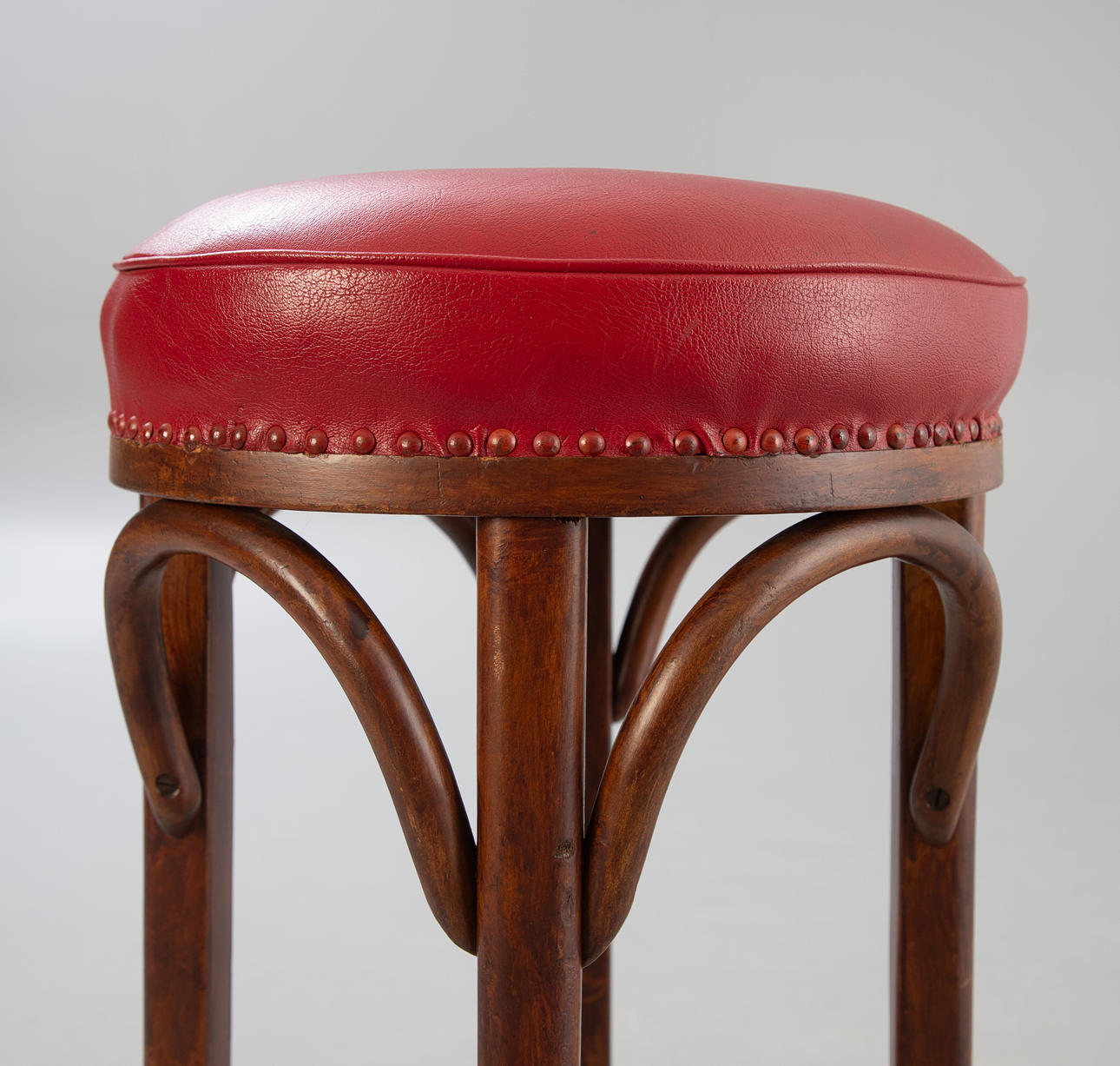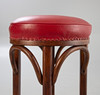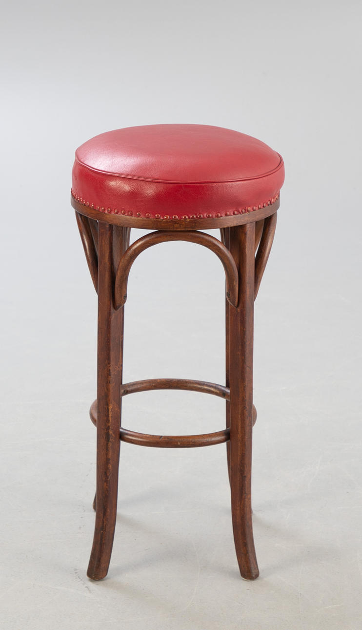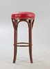4 Bugholz Barhocker aus der 1. Hälfte des 20. Jahrhunderts.Bugholz Gestelle, Federkern Sitzflächen aufgepolstert und mit rotem Leder bezogen, mit Polsternägelband fixiert.