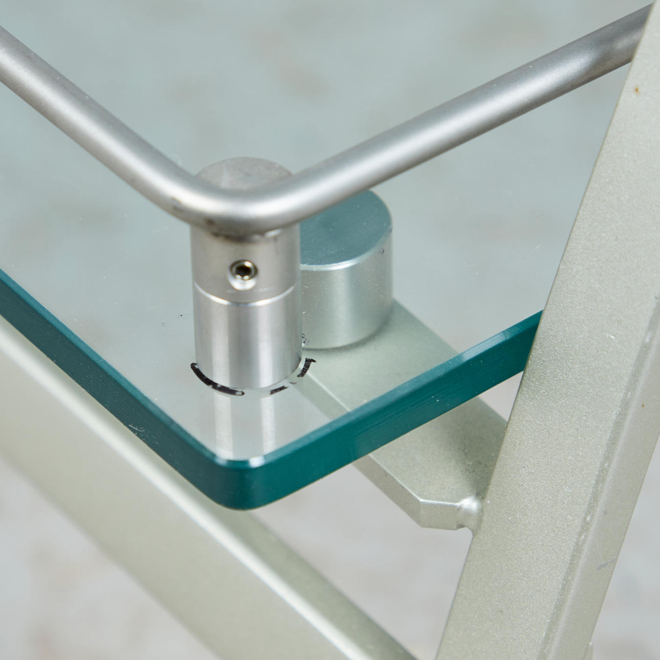 Rollwagen / Beistellwagen, Glas, Metall. Rechteckiger Servierwagen mit einem Gestell aus Metall und zwei Ablagen aus Glas, jeweils mit einer Metallumrandung, mit vier Rollen und einer Handhabe ausgestattet, H.81cm, L.78cm, B.40cm.