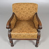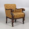 Sitz und Rückenlehne sind solide gepolstert, reich geschnitzte Verzierungen an den Armlehnen und Füßen.
