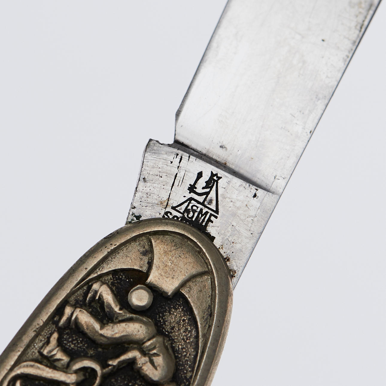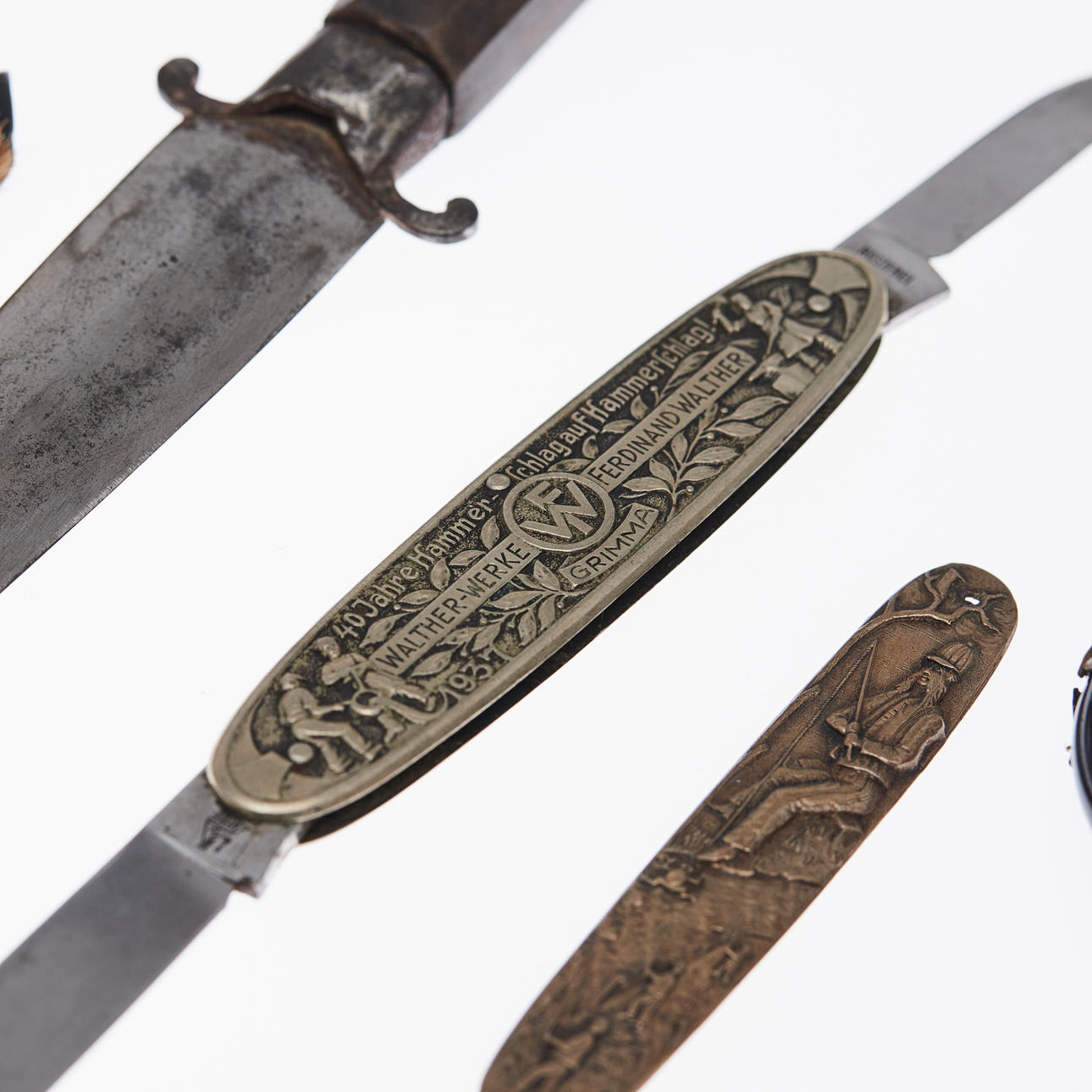 sowie diverse Metallgegenstände, darunter zwei Lorgnons / Stielbrillen, einem Solinger Jagdmesser mit Rehlauf, einem Dolch mit verziertem Holzgriff und einem Portemonnaie / Geldbeutel mit Perlmuttbeschlag, Maße: H.0,5-2,5cm, L.3-12,5cm, B.1,5-6,4cm