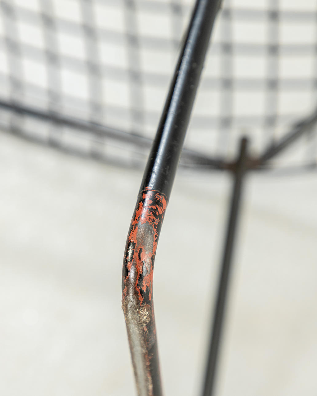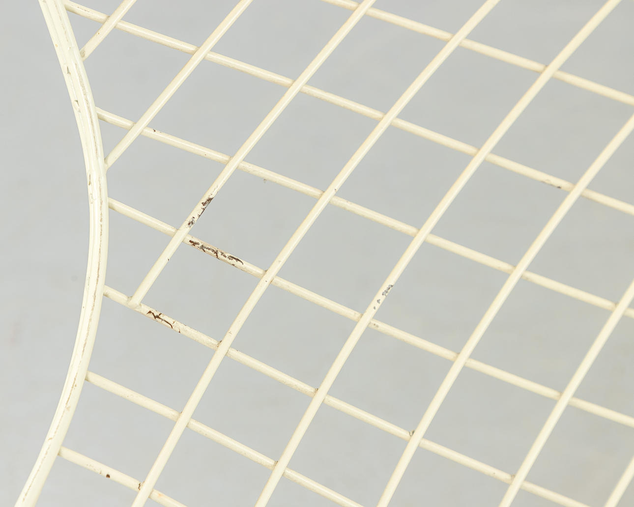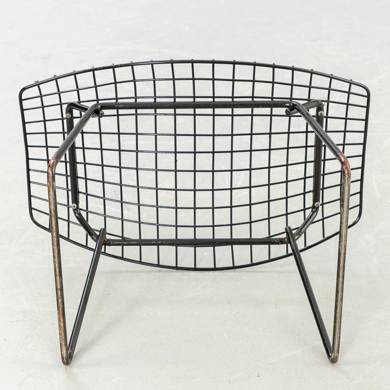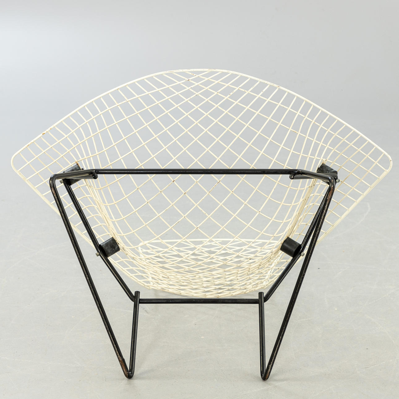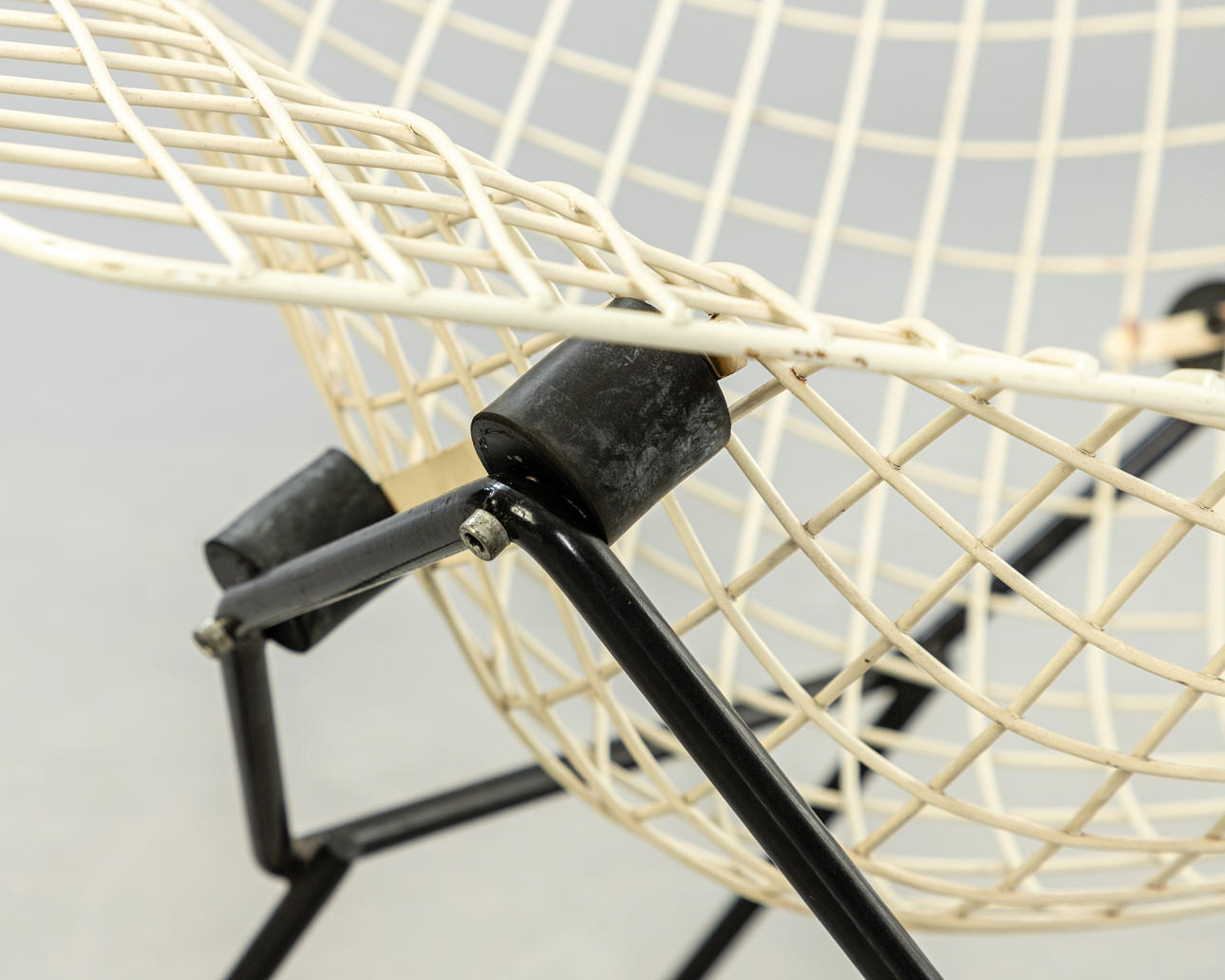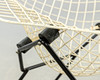 Entwurf 1950-52. Konstruktion aus weiß und schwarz ummanteltem Stahldraht. Die Sitzschale ist wippend auf Gummipuffern gelagert.