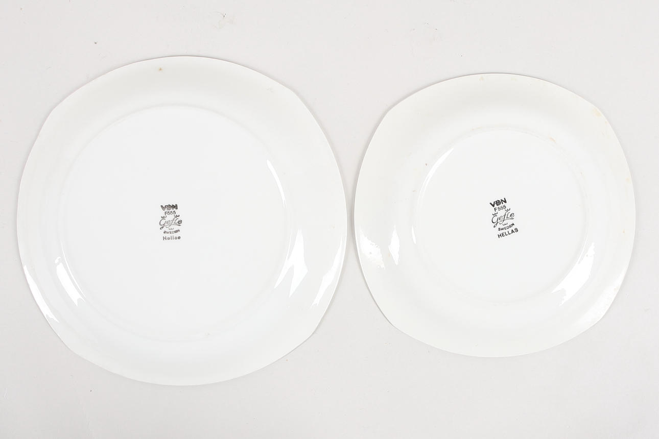 6 Speiseteller, ca. 23,5x23,5 cm. 4 x Beilagen, ca. 20,5 x 20,5 cm.