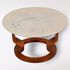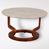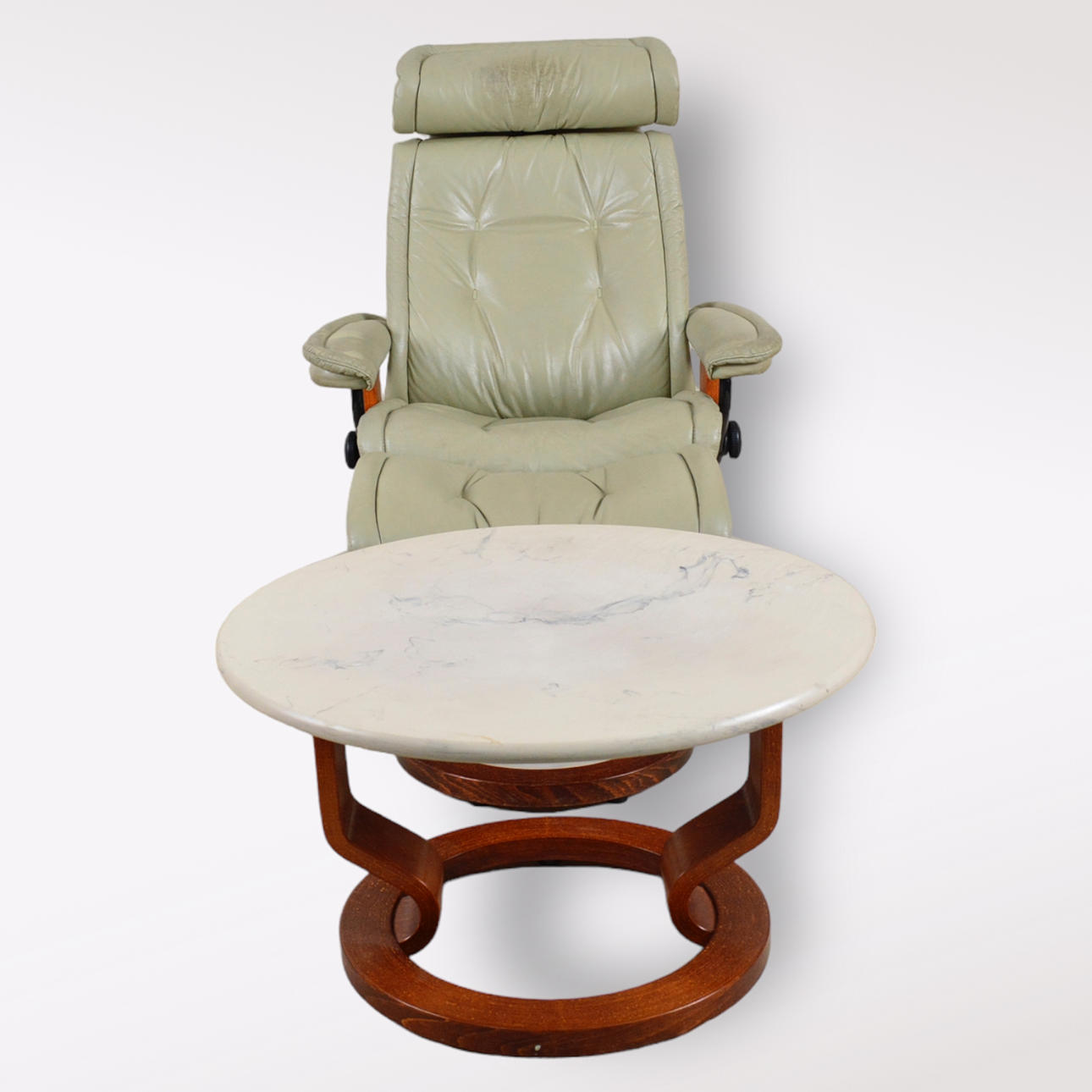 Tisch, Marmor/Haut und Holz, Durchmesser 70 cm, Höhe 42 cm. Sessel, verstellbar, Breite 78 cm, Tiefe 70 cm, Höhe 98 cm.