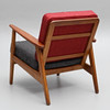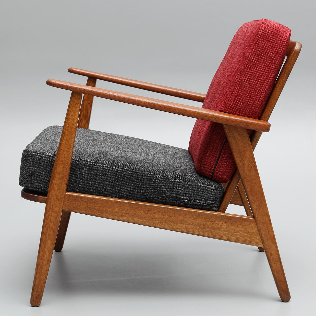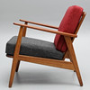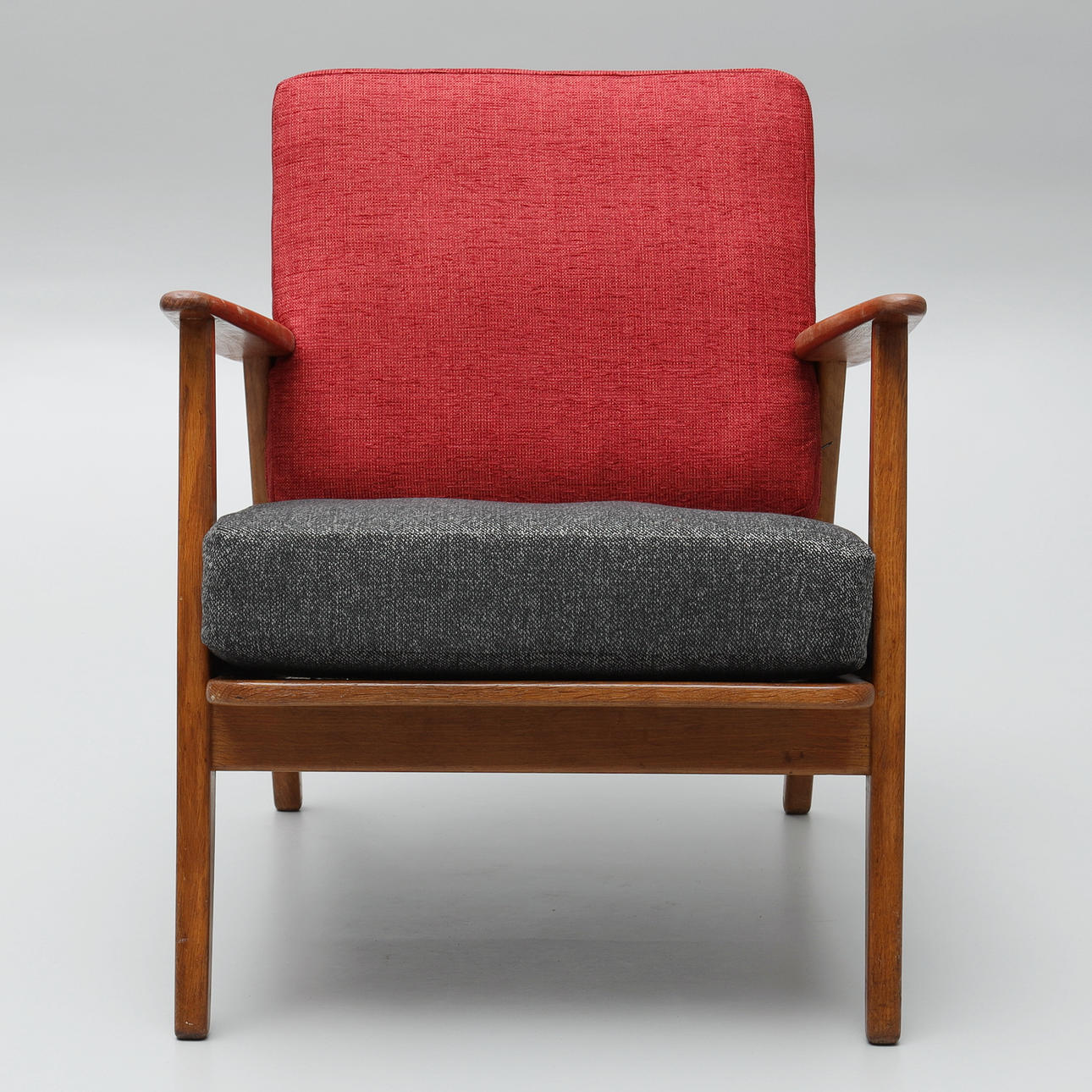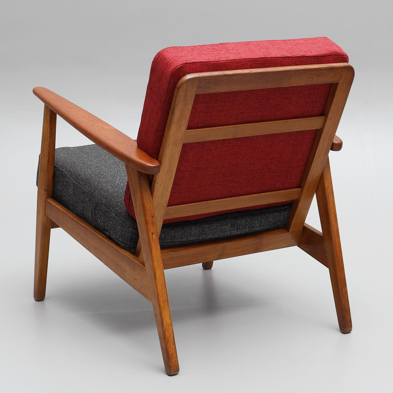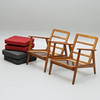 Zwei Sessel, Gestell aus Teakholz, lockere Plüschböden mit originaler Polsterung darunter. Sitzhöhe 42 cm.