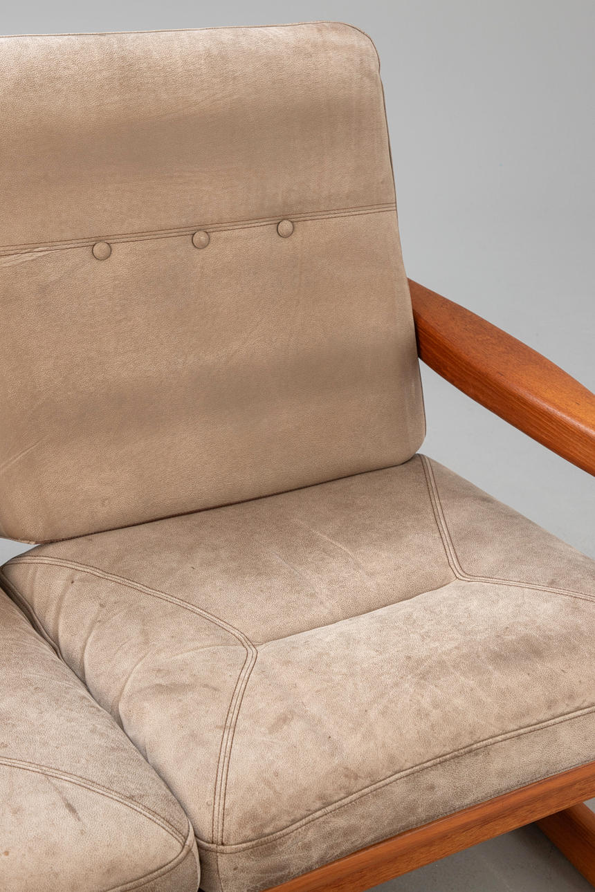 Dänisches Design. Massives Teakholz. Lose Polsterkissen mit hellbraunem Leder bezogen.