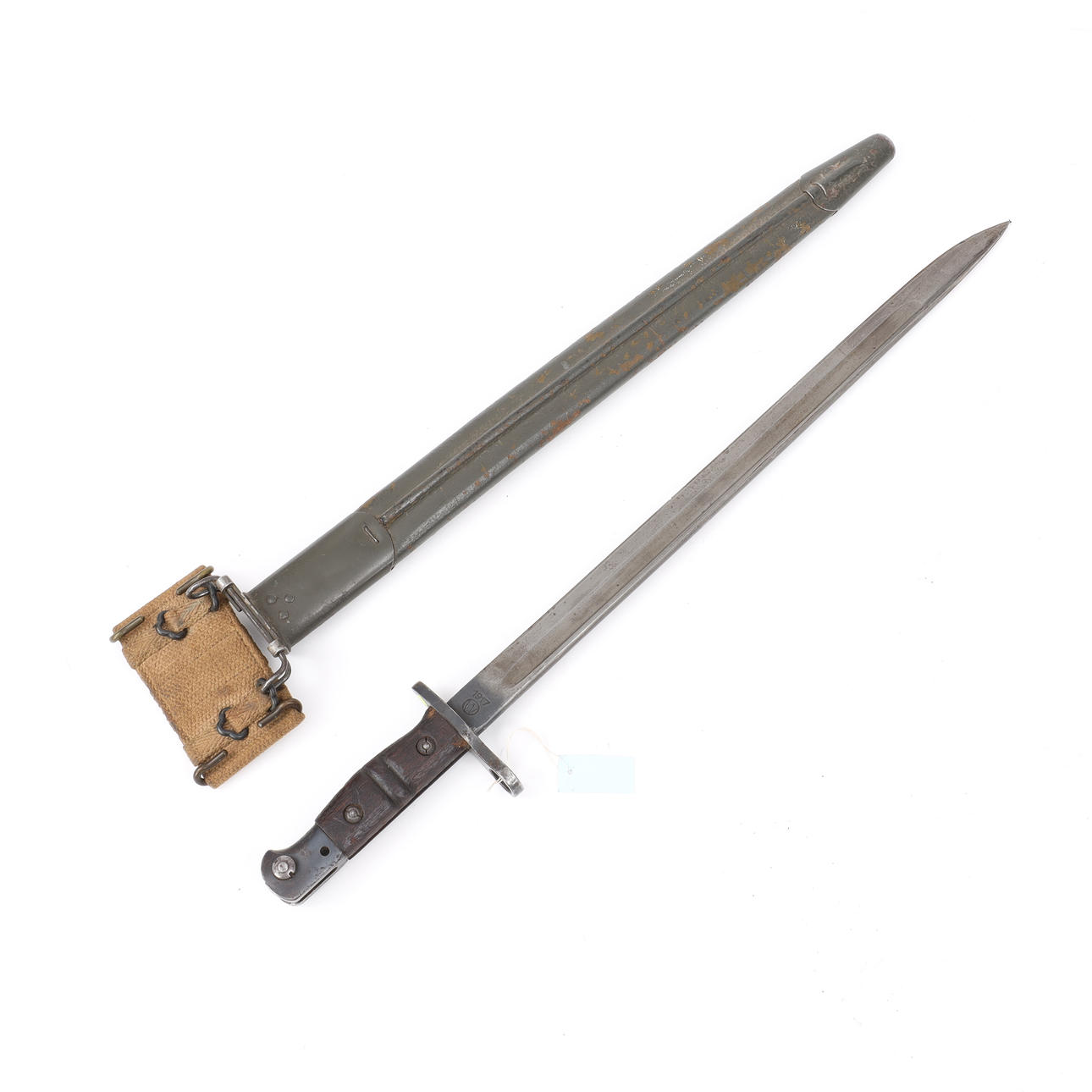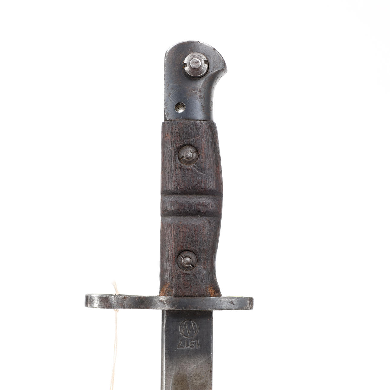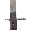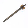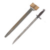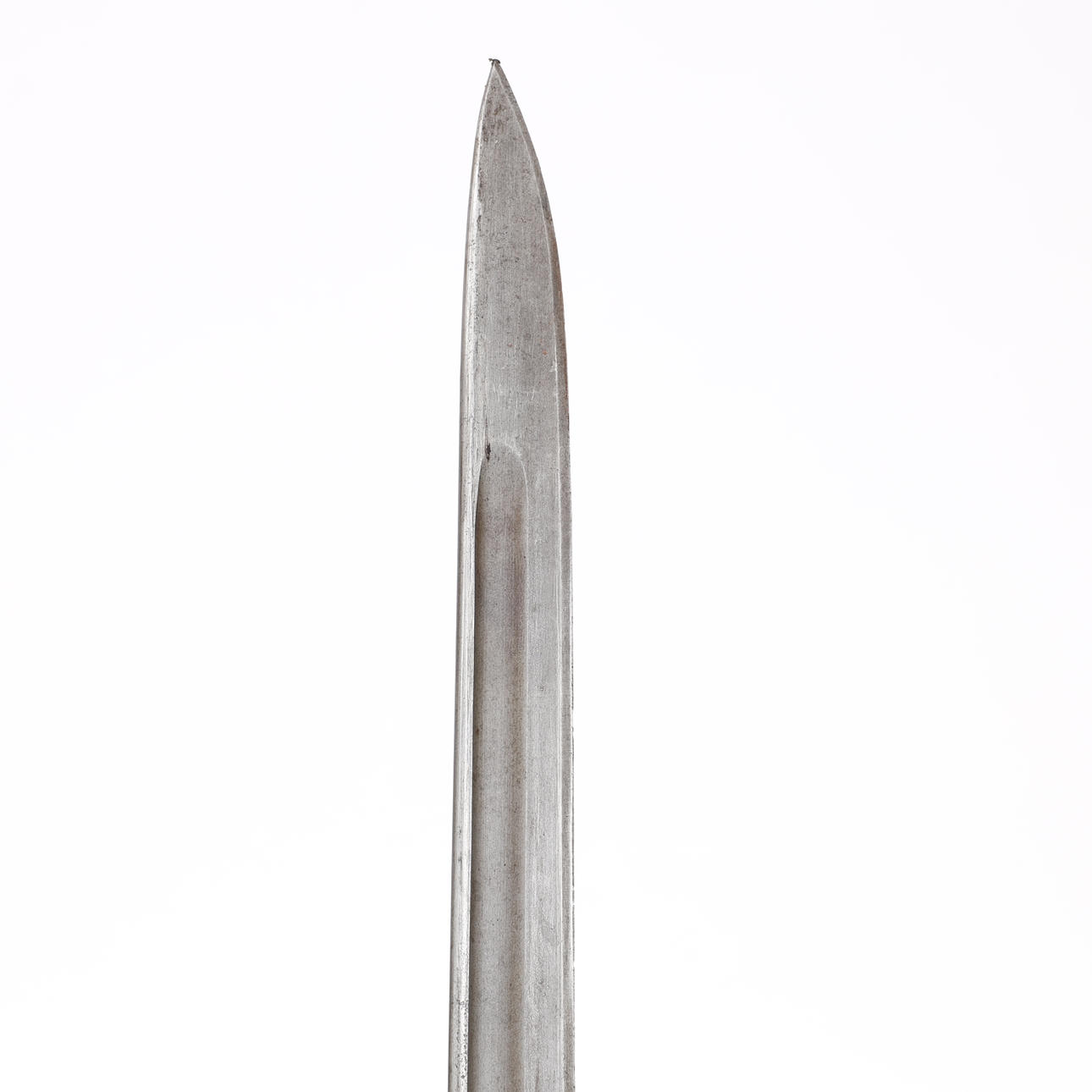 Stahlbügel mit Holzplatten, einschneidige Klinge mit Blutausgießer und abgerundeter Rückseite, Länge 43, Gesamtlänge 55,5 cm.