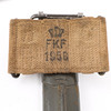 Grün lackierte Lederwanne mit Metallbeschlägen. Gürtelhaken zum Aufhängen.