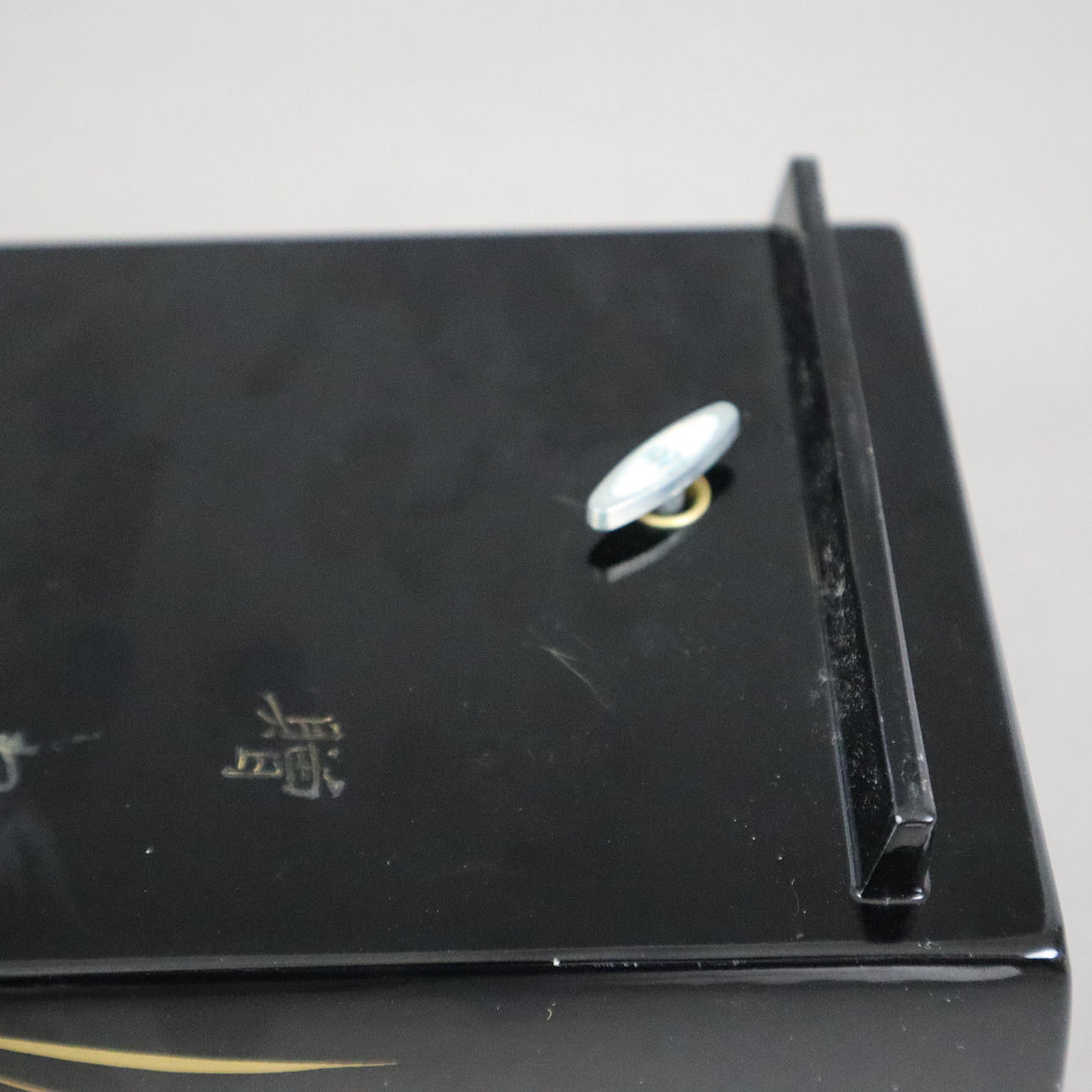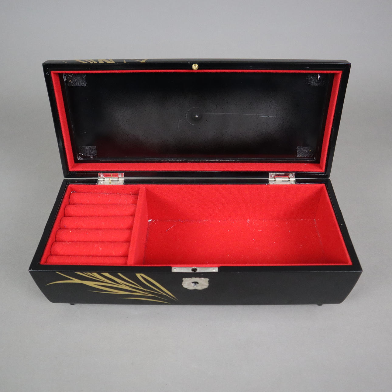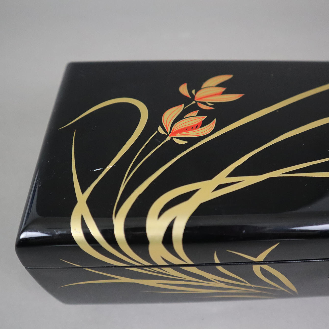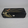 schwarzer Lack mit floralem Motiv, unterseitige Beschriftung lt. Berieben, innen mit Filz ausgeschlagen, Spielwerk, spielt das traditionelle japanische Lied „Kōjō no Tsuki“ (dt. Mond über der Burgruine), ca. 9 x 29,5 x 12,5 cm.