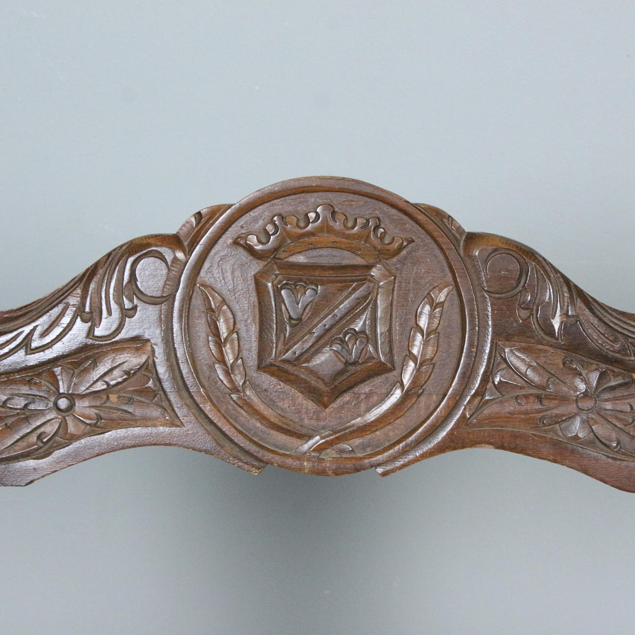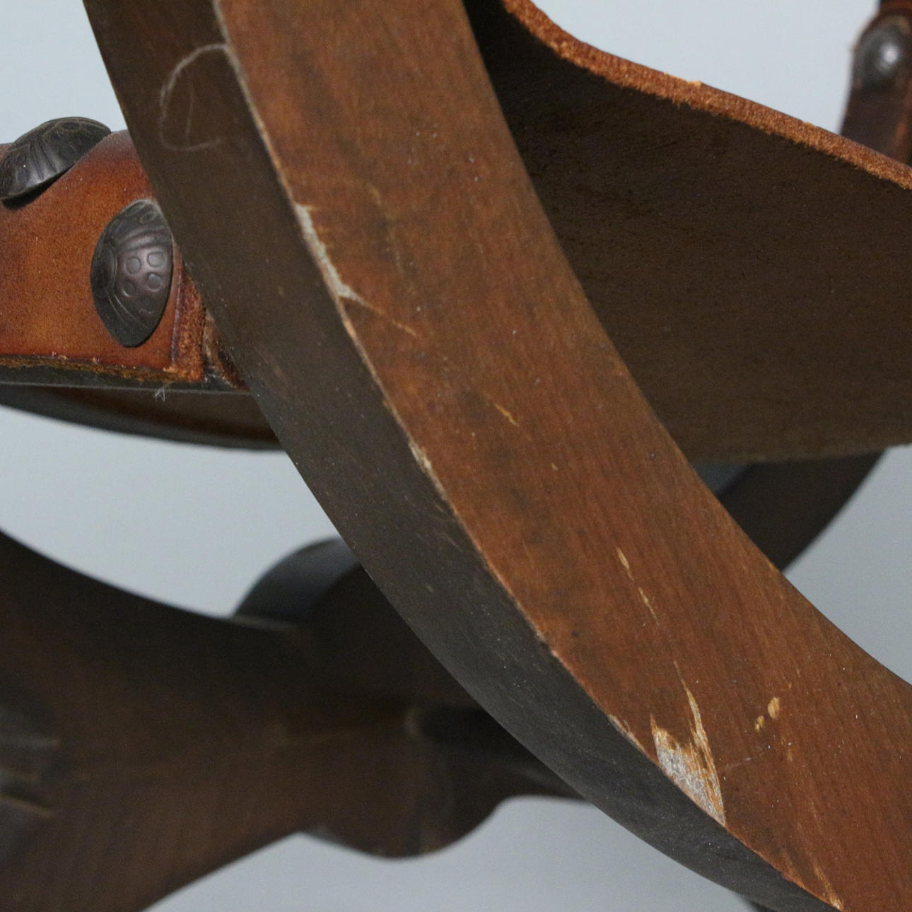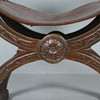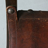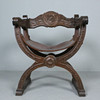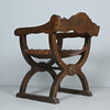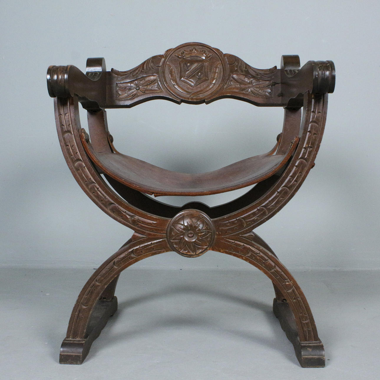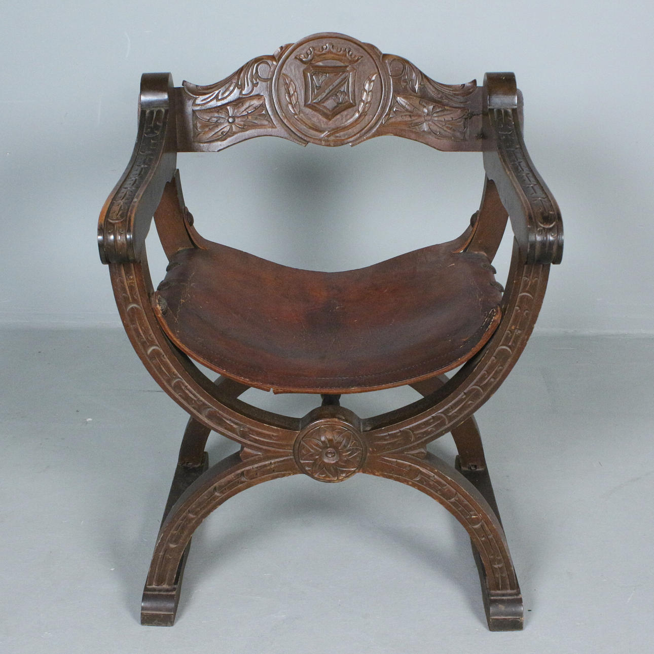 Sessel / Scherenstuhl mit Wappen, Holz, Leder, Maße ca.: H. 76 cm, B. 57 cm, T. 54 cm.