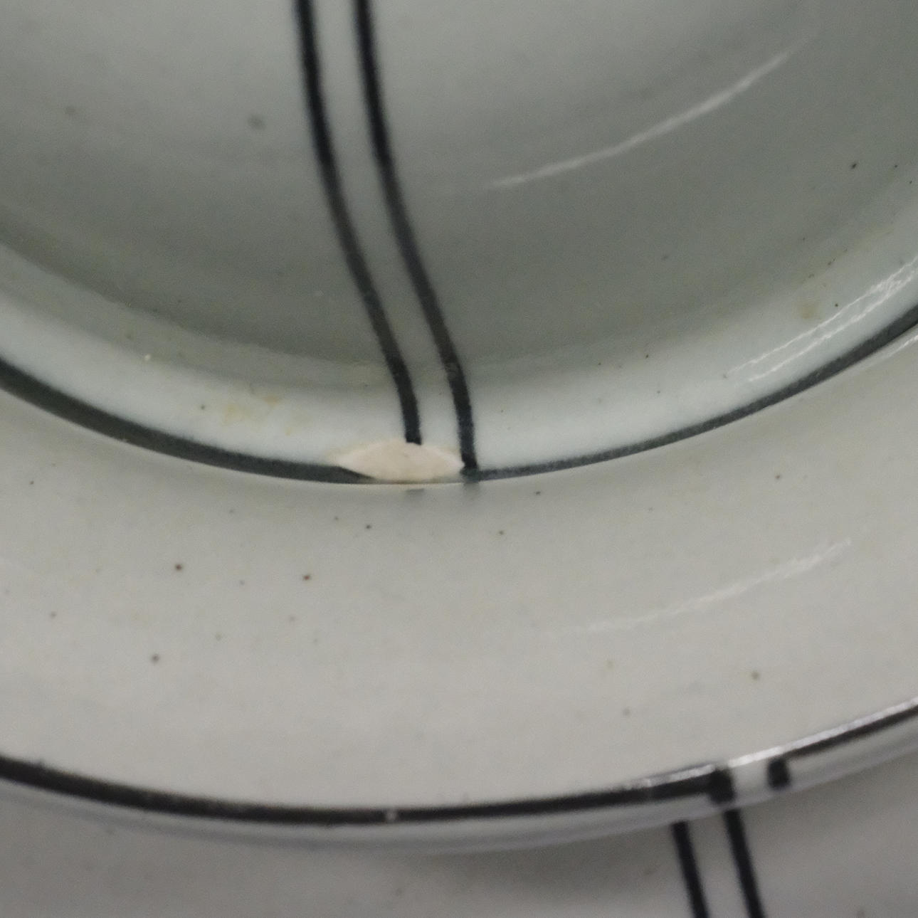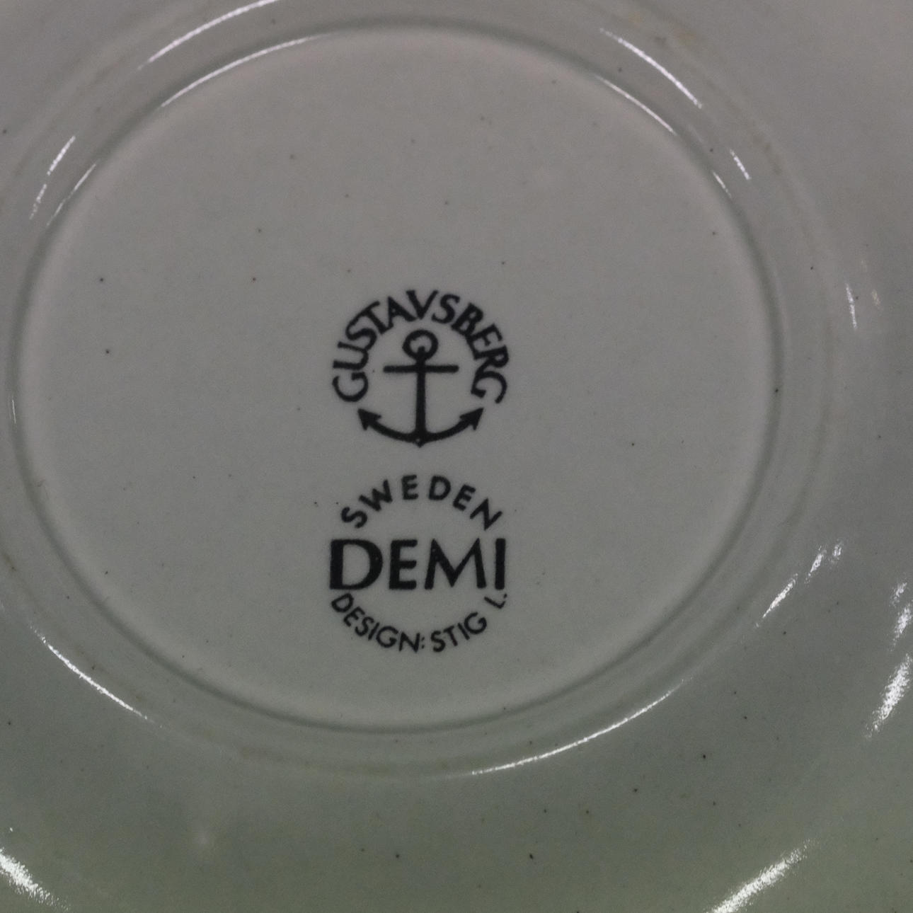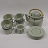 Sechs Tassen, Höhe 6,5 cm, Durchmesser 9,5 cm, sechs Untertassen, Durchmesser 15,5 cm, Sahnekanne, Höhe 6,5 cm und Teekanne, Höhe 15 cm.
