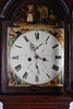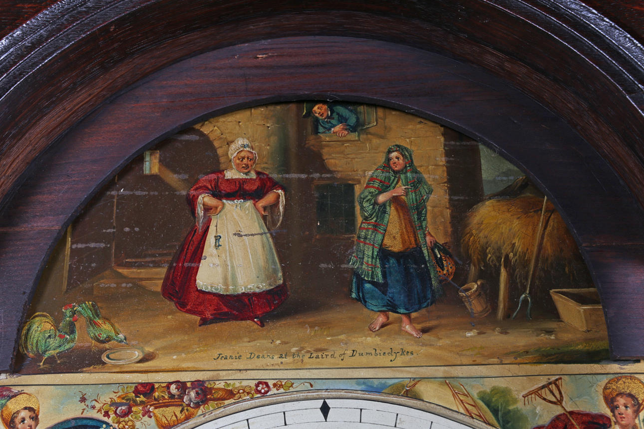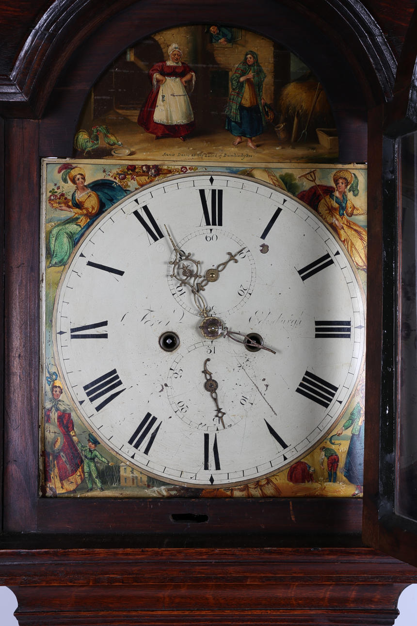 Eine Standuhr mit Eichenholzgehäuse aus George III., mit einem Schwanenhalsgiebel über einem bemalten Zifferblatt mit römischen Ziffern und Darstellungen von Bauernszenen und einem schlichten Gehäuse mit Säulen, 215 cm hoch.