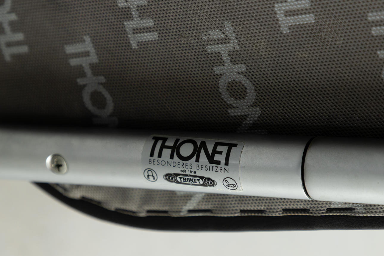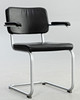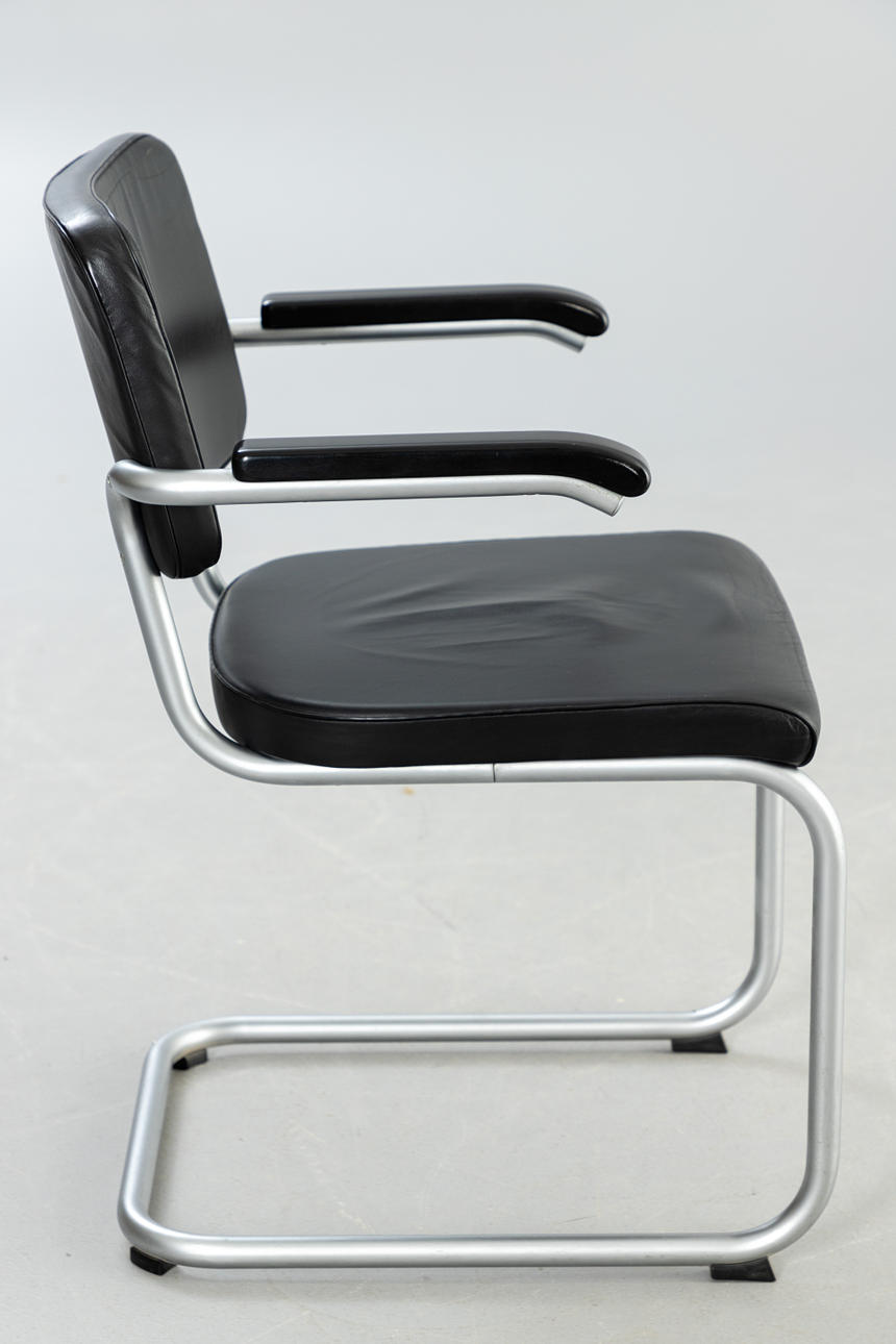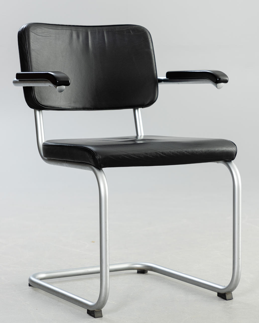 Thonet Freischwinger 'S 64 PV' von Marcel Breuer. Entwurf: 1928. Stahlrohrgestell, Sitz und Rücken aufgepolstert und mit Leder bezogen.