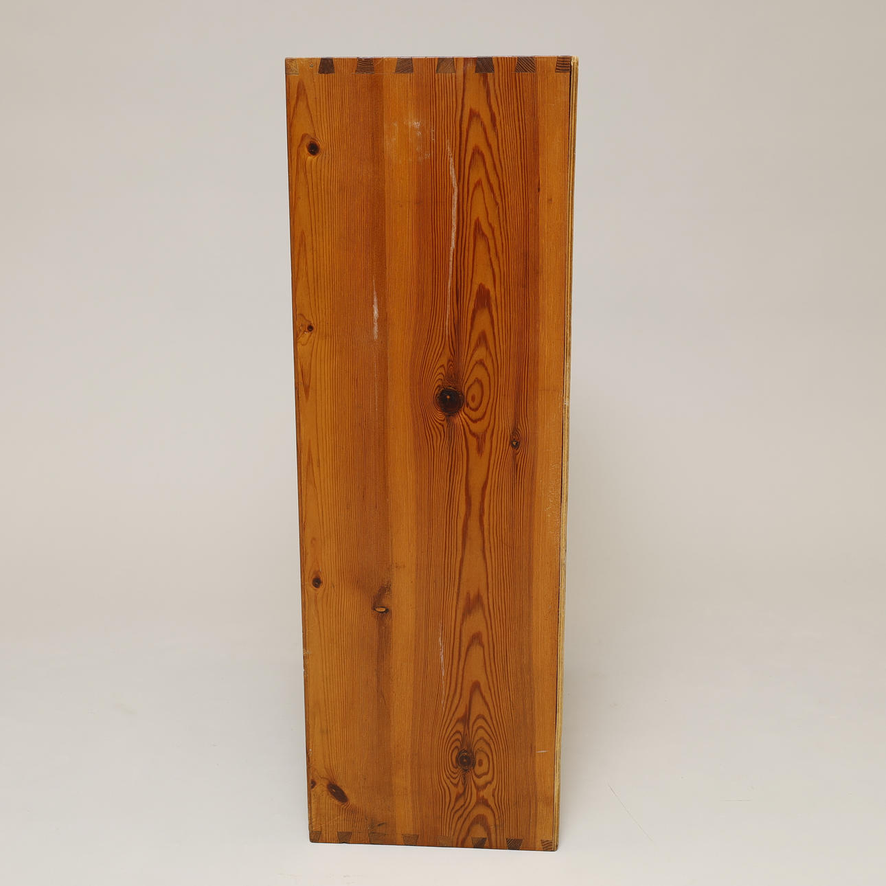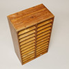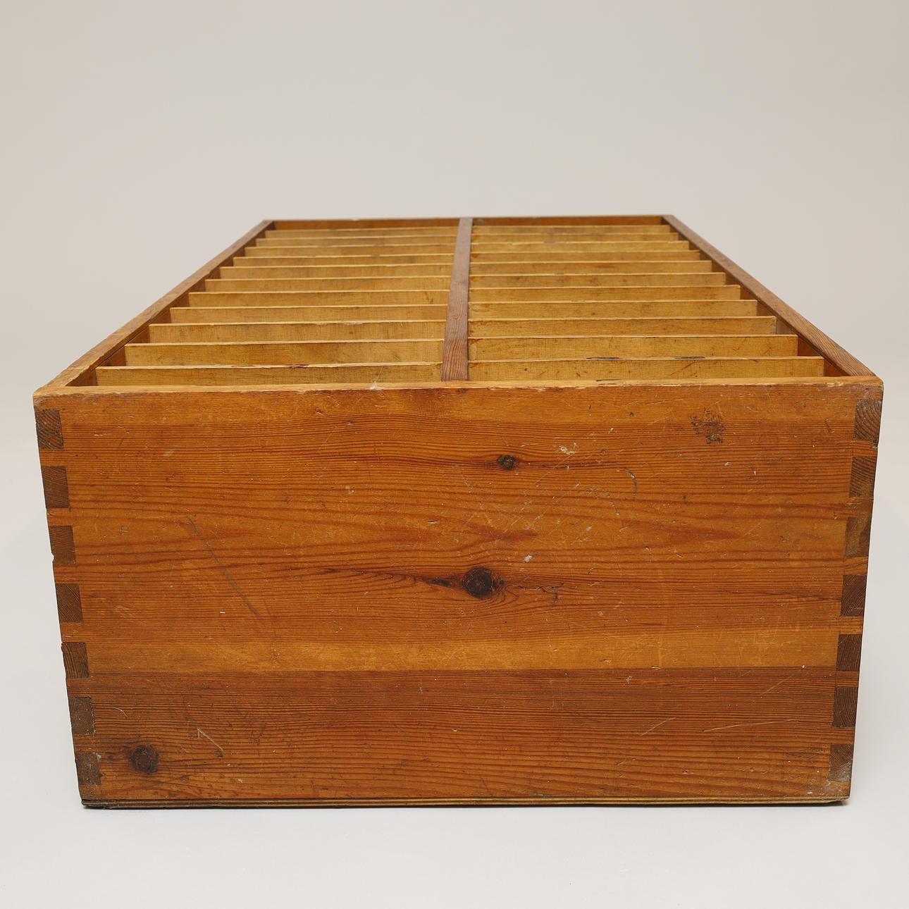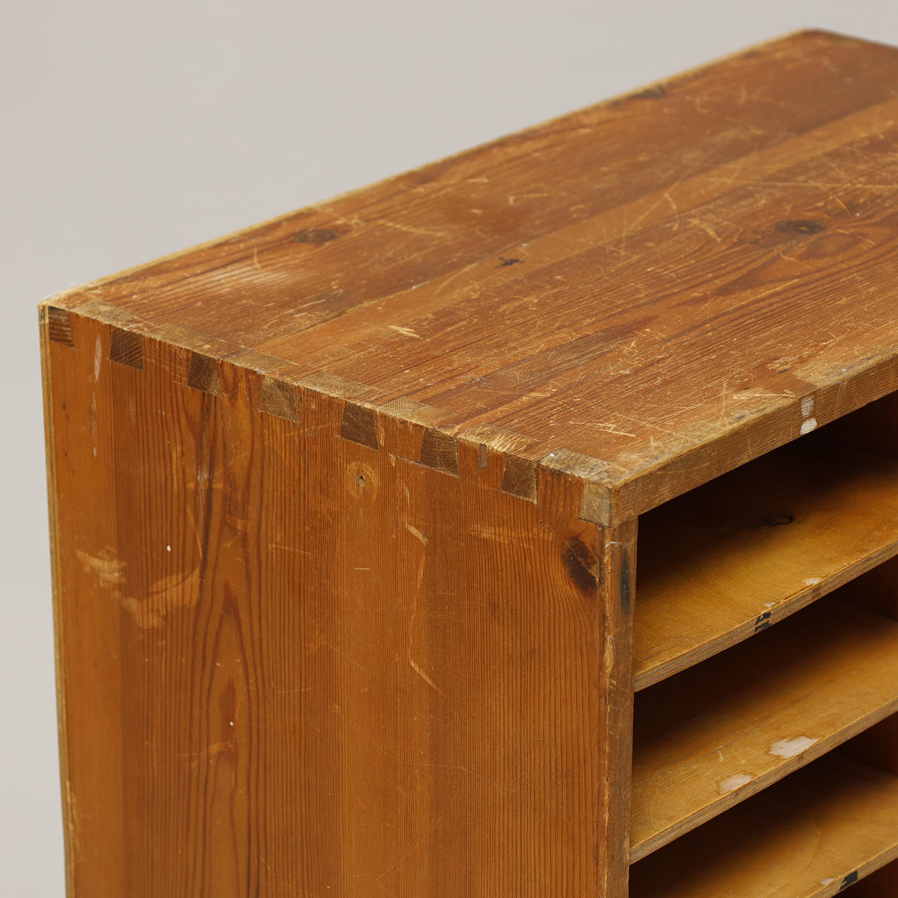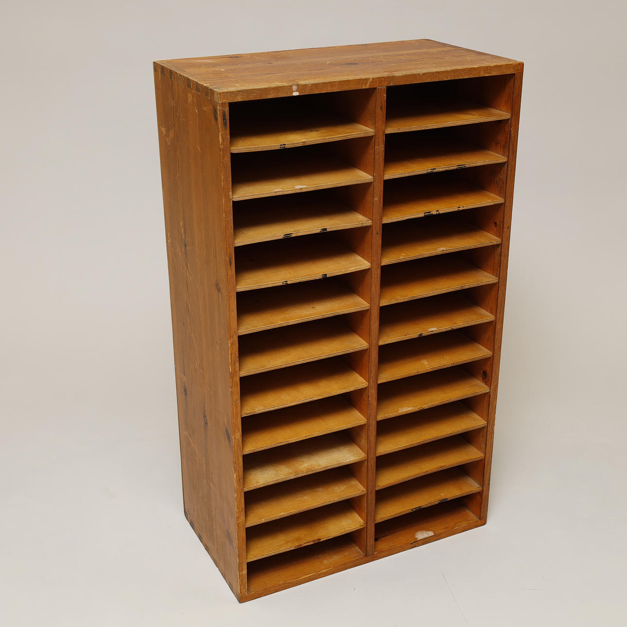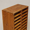 Aktenschrank oder Taubenschlag aus Kiefernholz mit laminierten Regalen und Holzrückplatte. Schwalbenschwanzgelenke. 24 Regale mit 12 auf jeder Seite, die durch mittlere Sprossen unterteilt sind. Wahrscheinlich in Dänemark hergestellt.