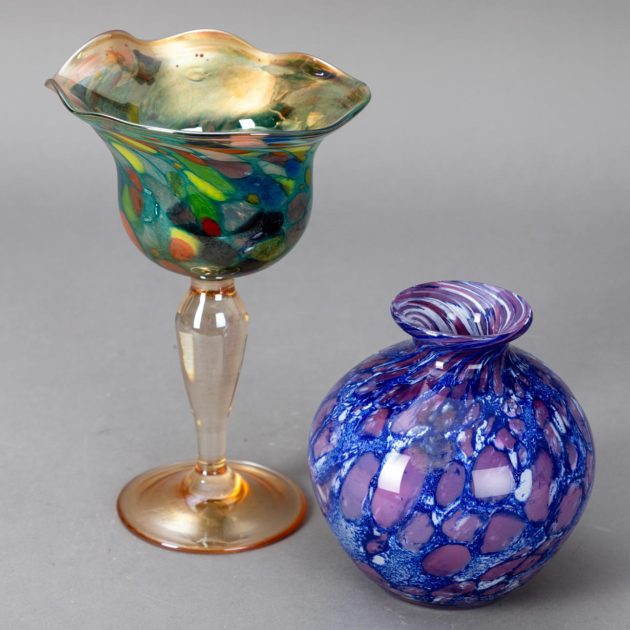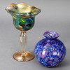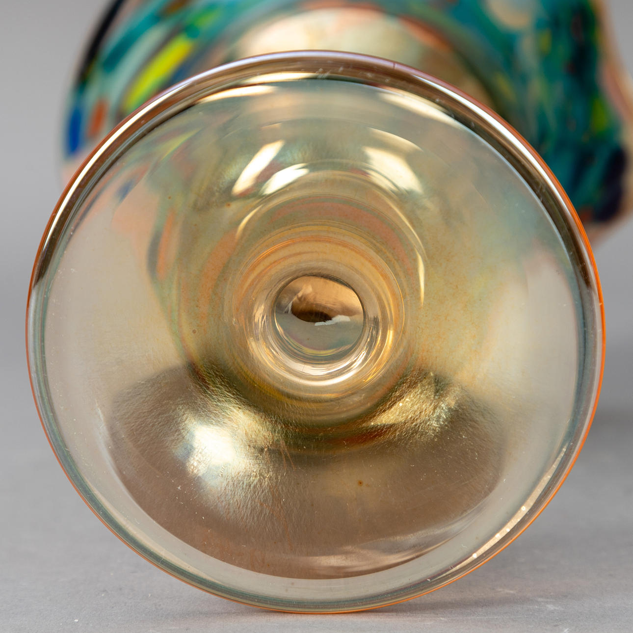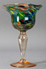 Fußschale von Peter Kaspar, 1988. Signiert und datiert, Nr. 9 von 49. Kelchform mit Stiel und großem Standteller. Verschiedenfarbiges Glas, Standfläche und oberer Rand in Gold-Rosalin-Tönen, irisierend. ca. H 25.5 cm.