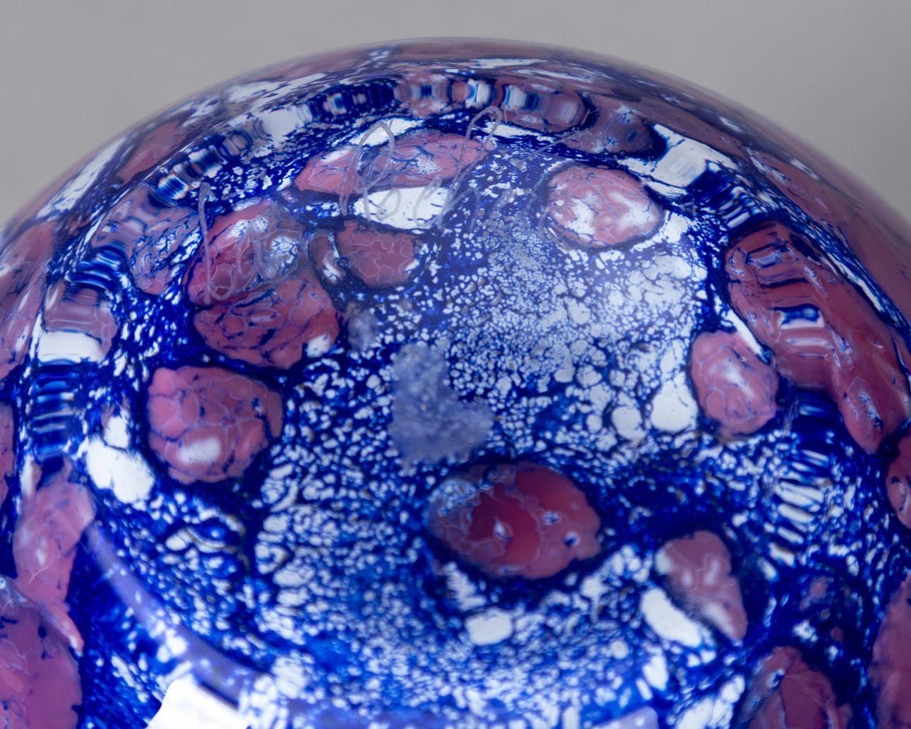 Kugelvase von La Rochère, Verschiedenfarbiges Glas, bauchiger Korpus mit kurzem Hals und breit ausgestellter Lippe. Unterhalb signiert. ca. H 16 cm.