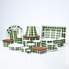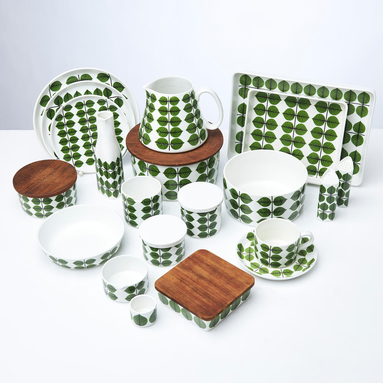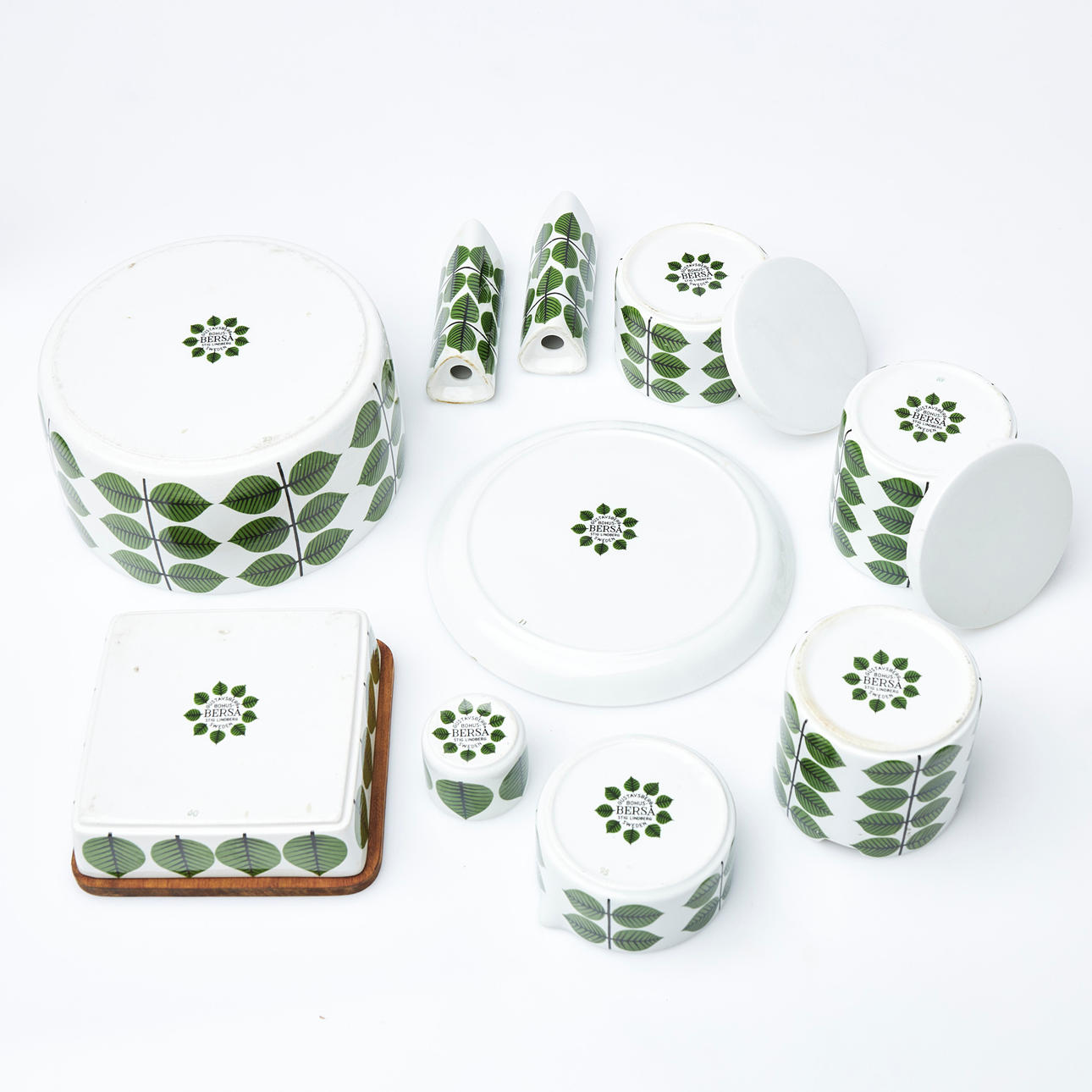 11 große Untertassen, 11 mittelgroße Untertassen, 12 kleine Untertassen, 10 Schüsseln, 1 Krug, 3 Karotten, 3 Formen, 2 Sprinkler, 3 Gläser, eines mit Deckel, 1 Vase, 8 Eierbecher, 4 Teetassen mit Untertassen+3 Tassen.