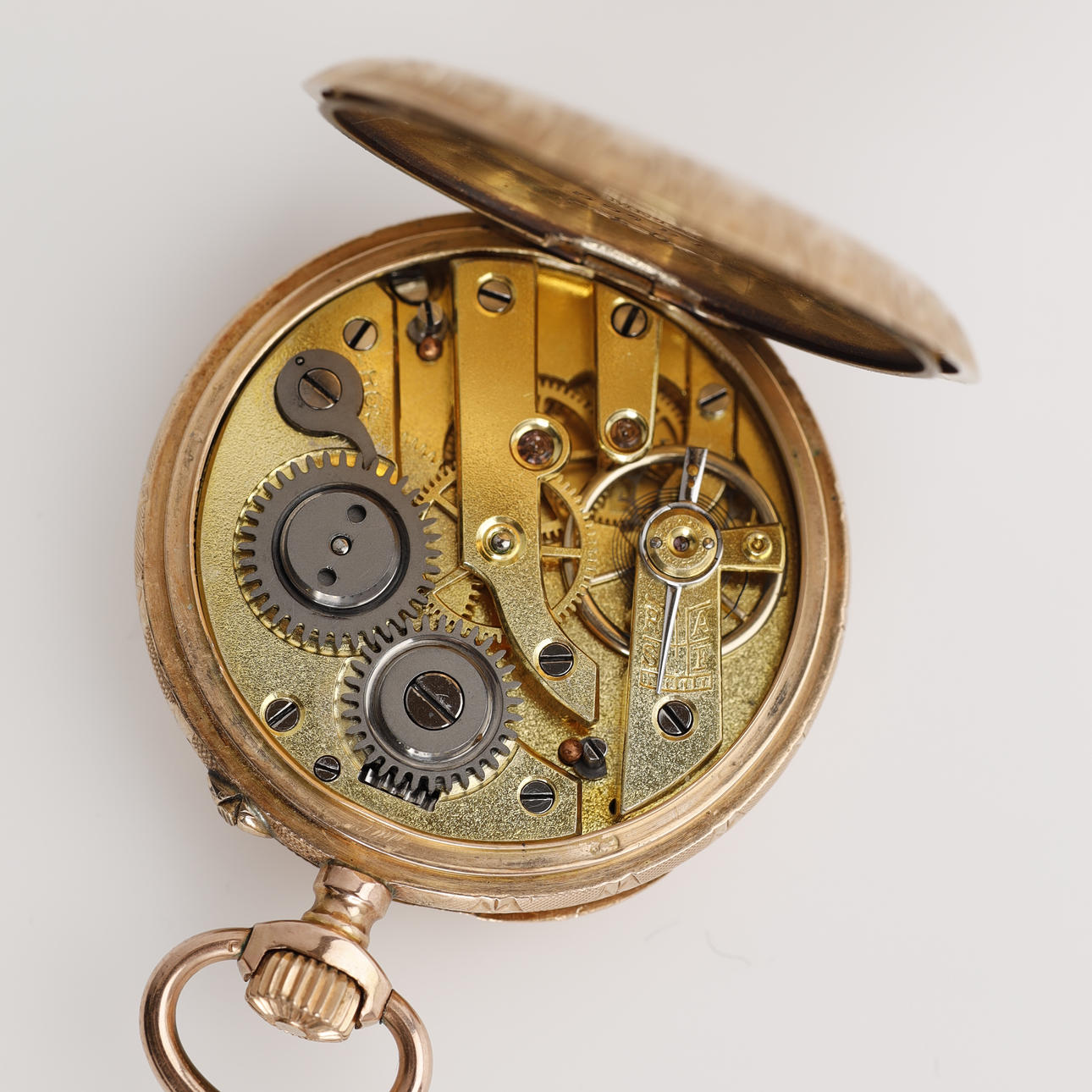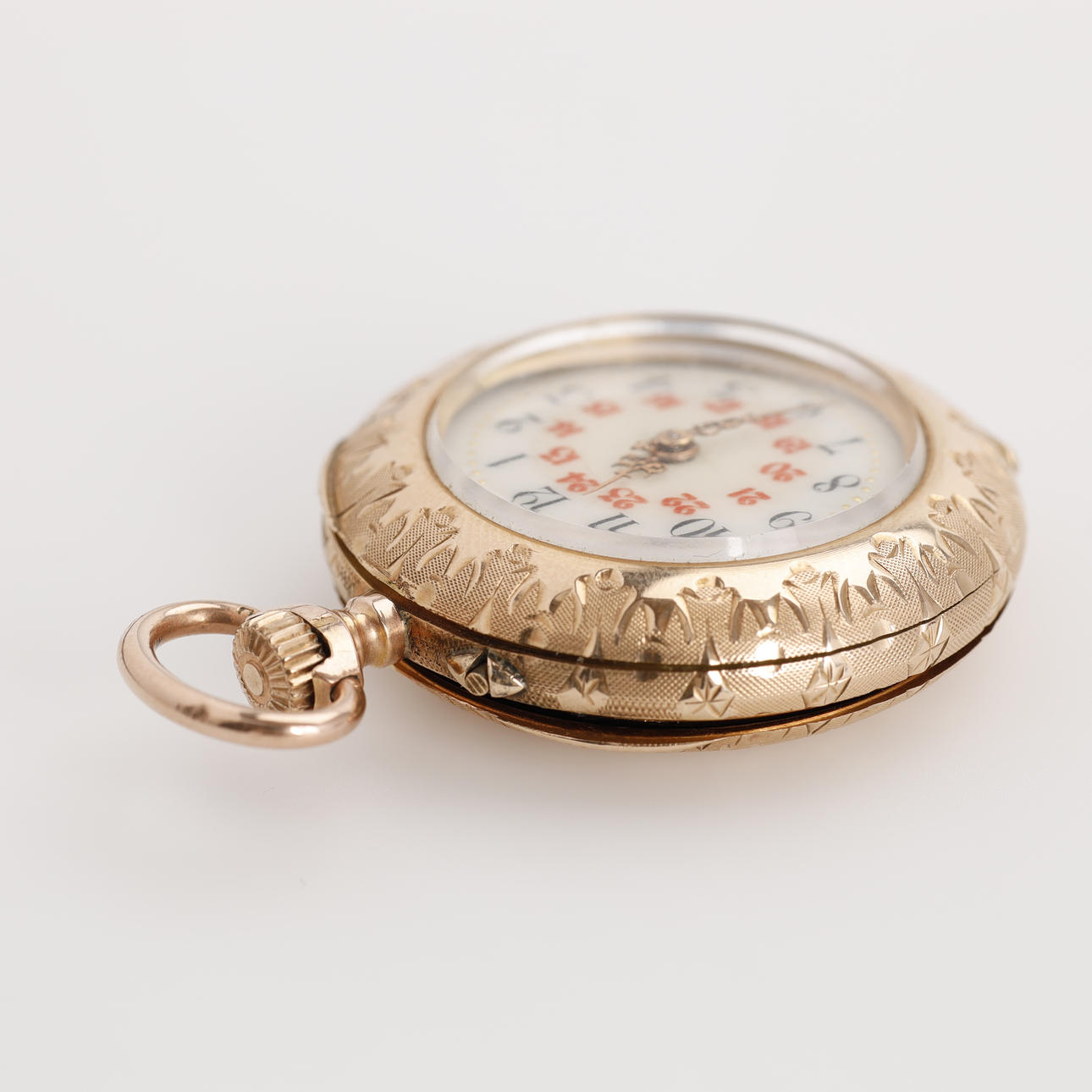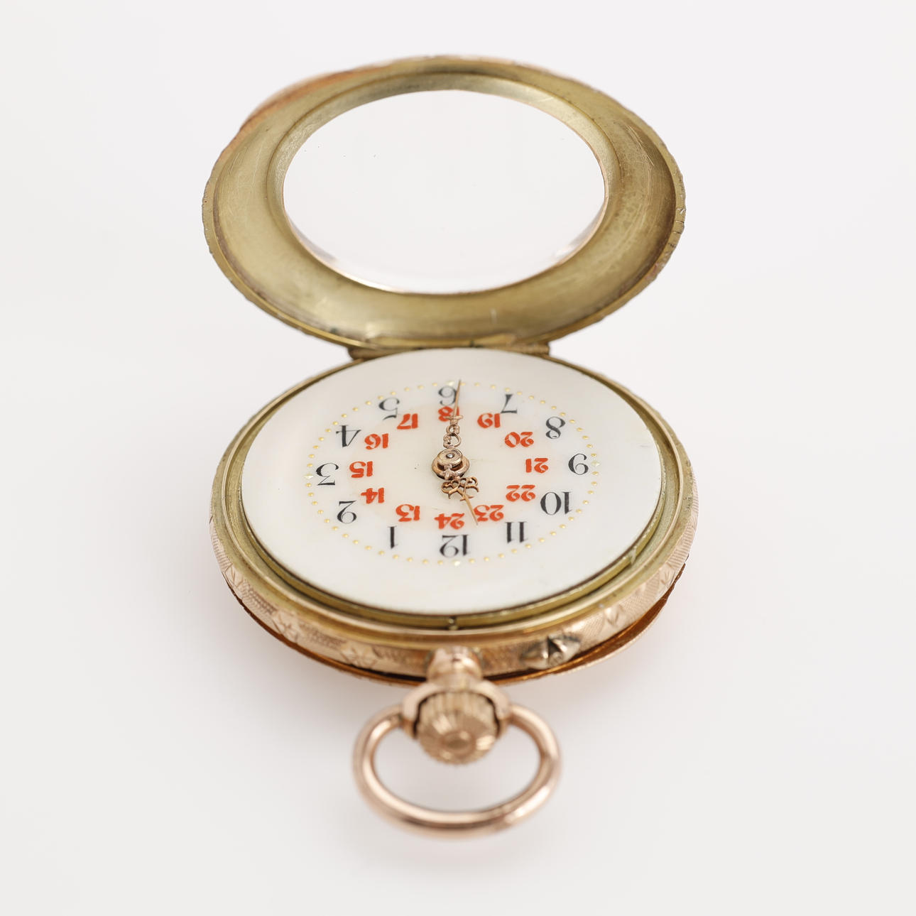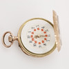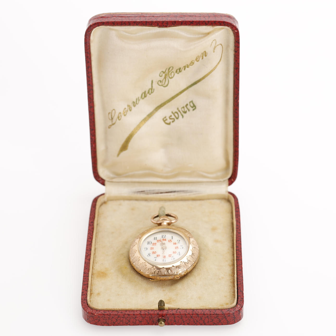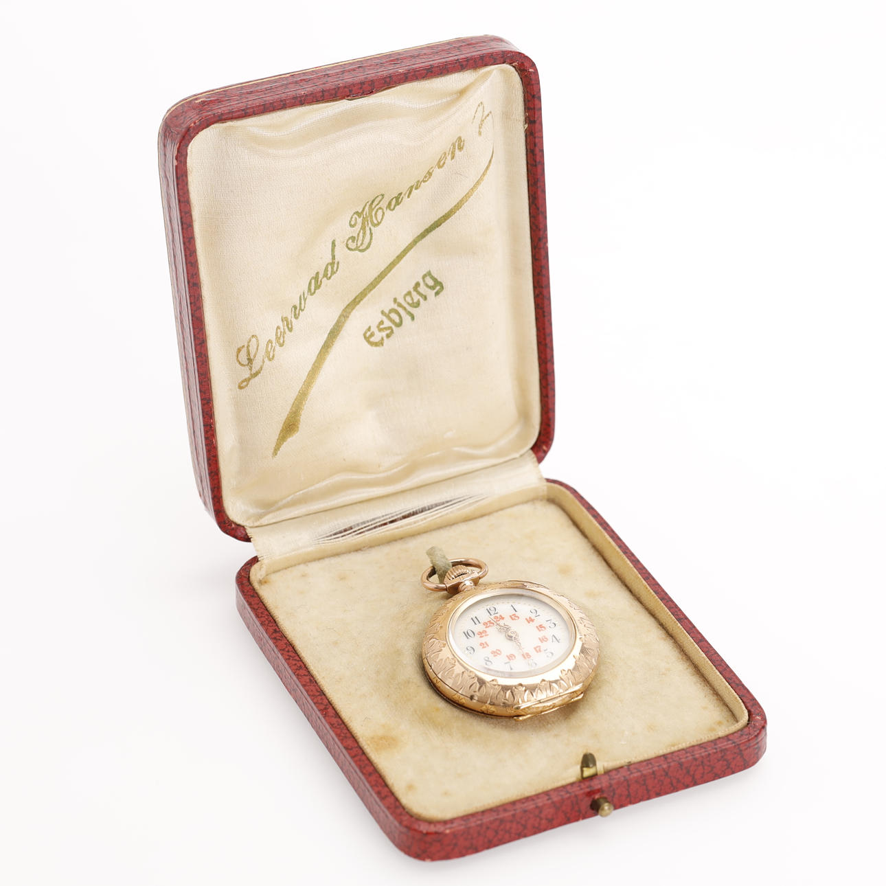 Damen-Taschenuhr, Doppelgehäuse, 14 Karat Gold. Das Gehäuse ist gestempelt und aus 14-karätigem Gold gefertigt. Staubkapsel aus Metall. Zifferblatt mit arabischen Ziffern in Rot und Schwarz. Louis Quinze Visiere, Kronenerhöhung, Durchm.(ohne Krone): ca. 32 mm Gewicht ca. 26 g. Geliefertes originales Uhrengehäuse von „Leervad Hansen, Esbjerg“.