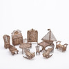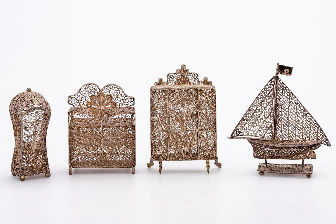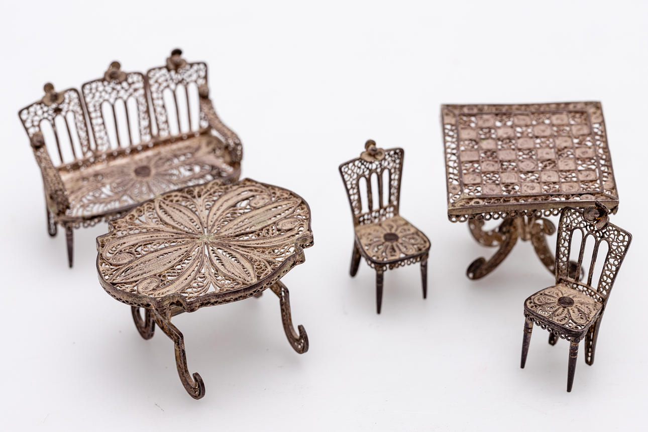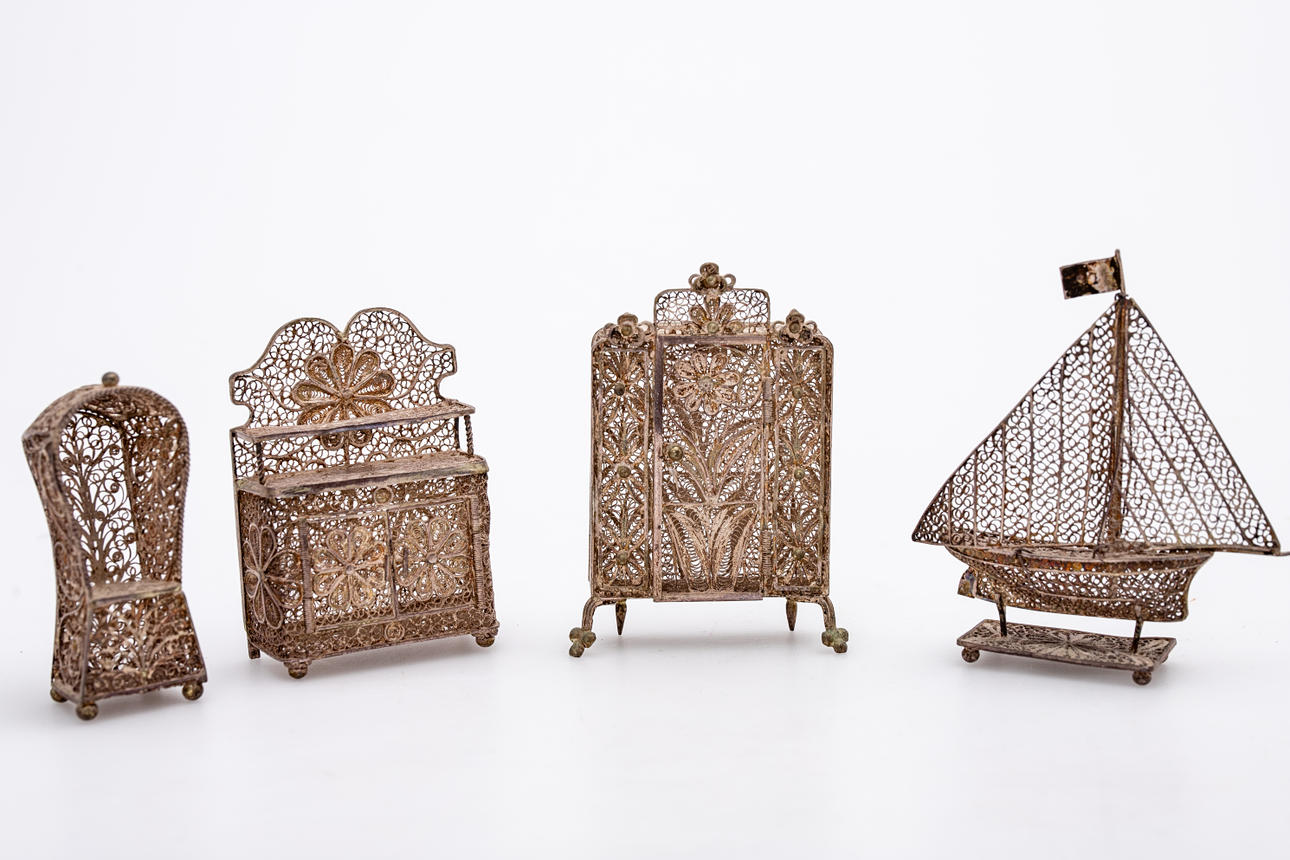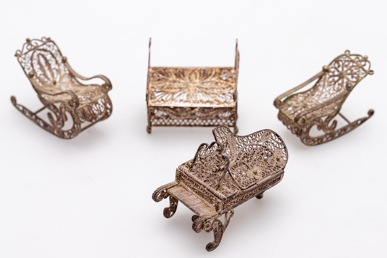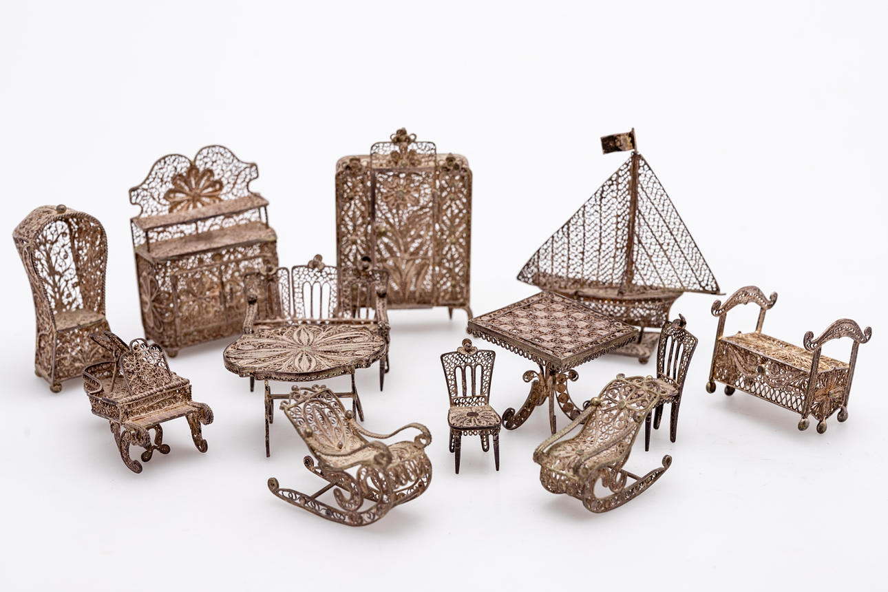Silber, Filigranarbeit. In verschiedenen Ausführungen. 12-tlg, bestehend aus 1 Buffet, 1 Schrank, 1 Klavier, 1 Bank, 2 Stühlen, 2 Tischen, 2 Schaukelstühlen, 1 Sessel, 1 Wiege und 1 Schiffsmodell. H: ca. 3 bis 8 cm, zus. ca. 211 g. Teilweise geprüft und mit Silberstempel.