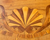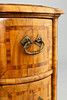Nußbaum auf Nadelholz furniert mit Bandeinlagen aus verschiedenen Hölzern. Auf kleinen Ballenfüßen die passig geschweifte Zargen. In der mehrfach geschweiften Front drei Schubladen. Korrespondierende, leicht überstehende Deckplatte mit abgesetztem Rand. Auf der Oberfläche gegliedert geschweiftes Bandelwerk mit zentraler Muschel. Allumfassend Furnierfelder in breiter Bandrahmung und eingefasste Schlüsselschilder. Zentrale Schließmechanismus (funktioniert nicht mehr). Messsingbeschläge. HxBxT: ca. 85 x 117 x 65 cm.