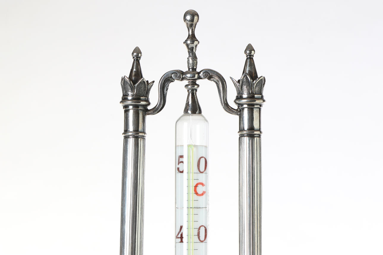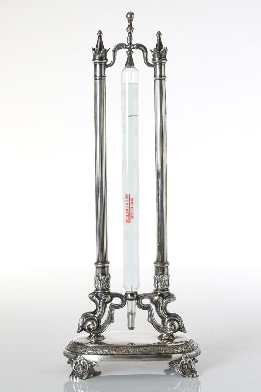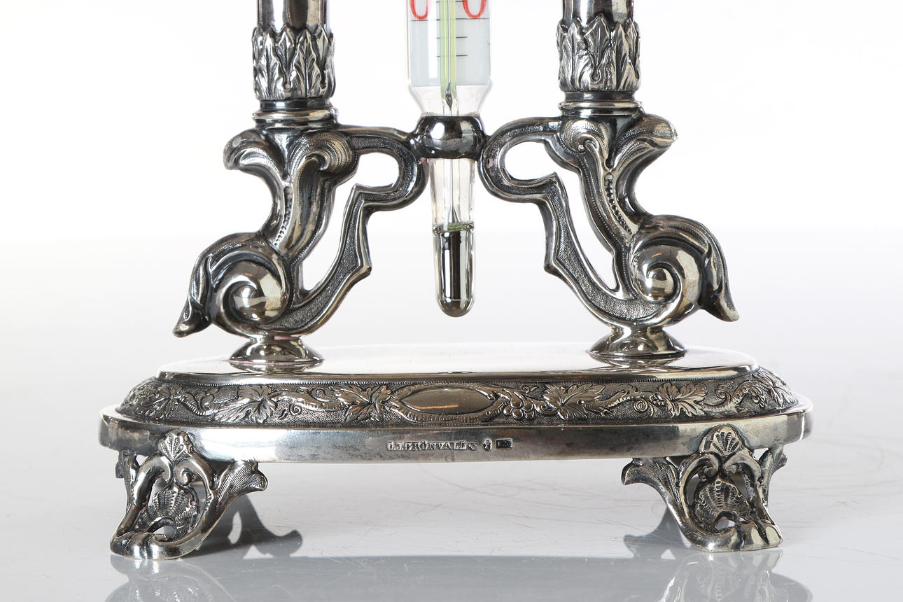Silber mit Glasthermometer. Neorokoko, hergestellt 1865. Das Thermometer stand auf der Rückseite mit der Aufschrift Schlaug & Son, Stockholm. Höhe 35 cm.