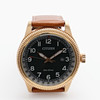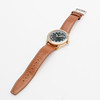 Vergoldeter Stahl, Photovoltaik-Quarzuhrwerk, originales Lederarmband, Gehäusedurchmesser 42 mm.