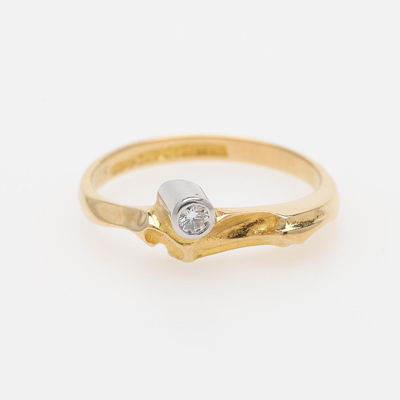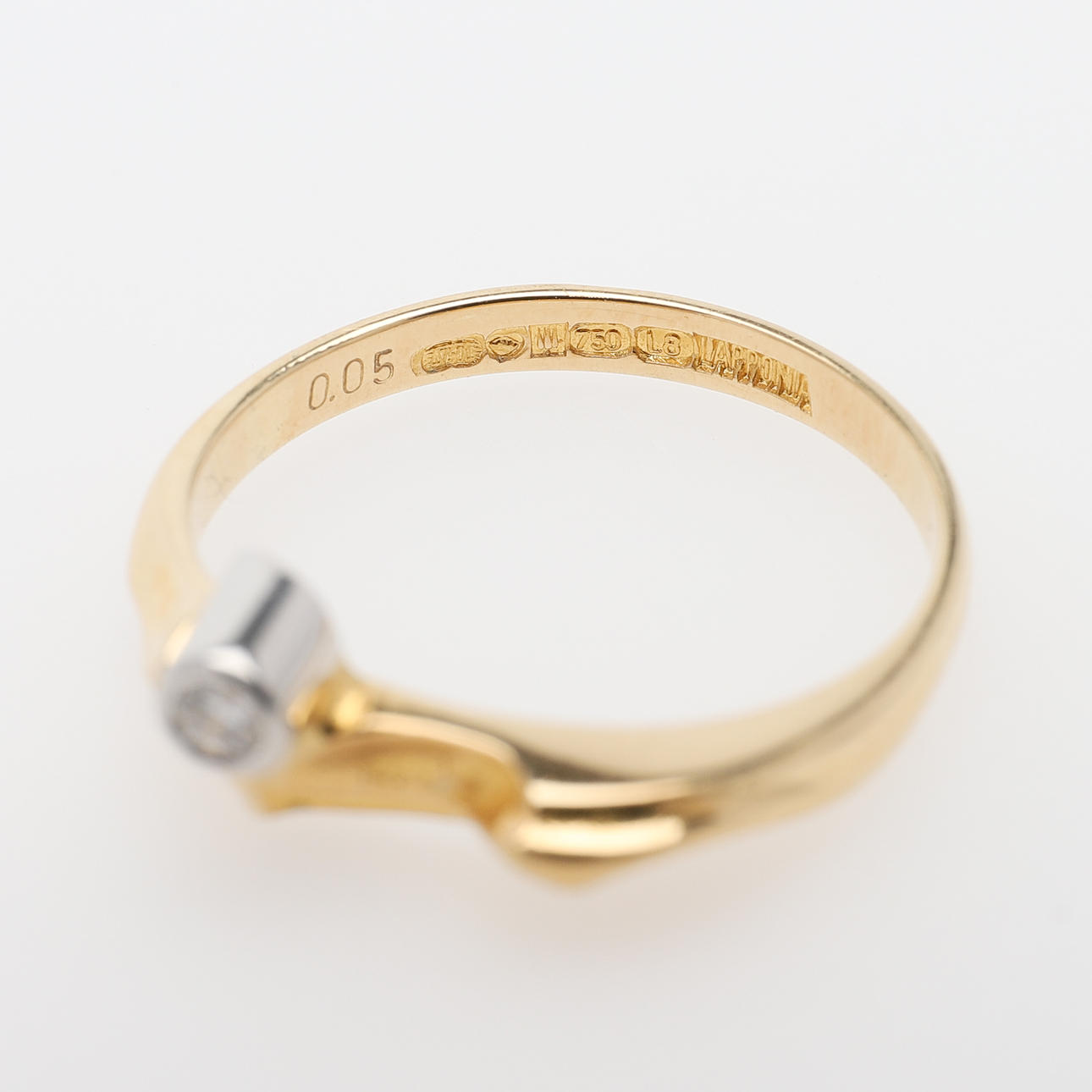 18-karätiges Gold mit Diamant von 0,05 ct, mit finnischen Stempeln 1988, Größe 17, Gewicht 3 Gramm, mit schwarzem Wildlederbeutel.