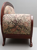 Pfotenfüße, Rücken und Sitz fest gepolstert, Holzschnittdekor mit Voluten und Fleuronen.
