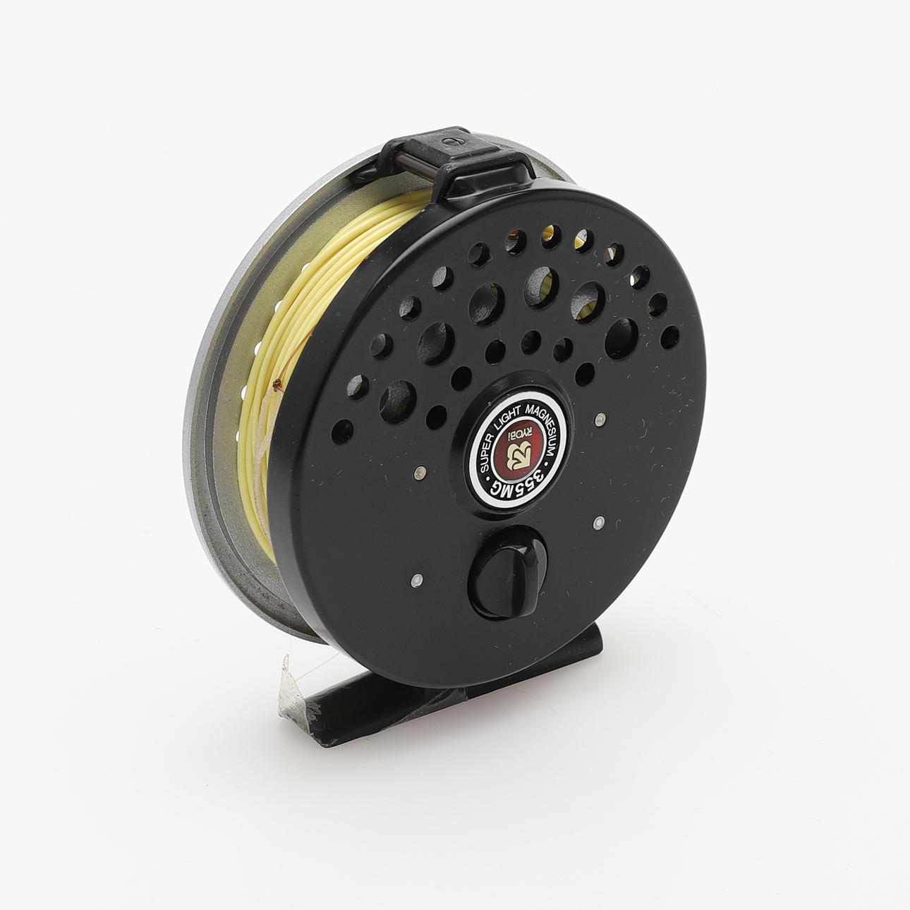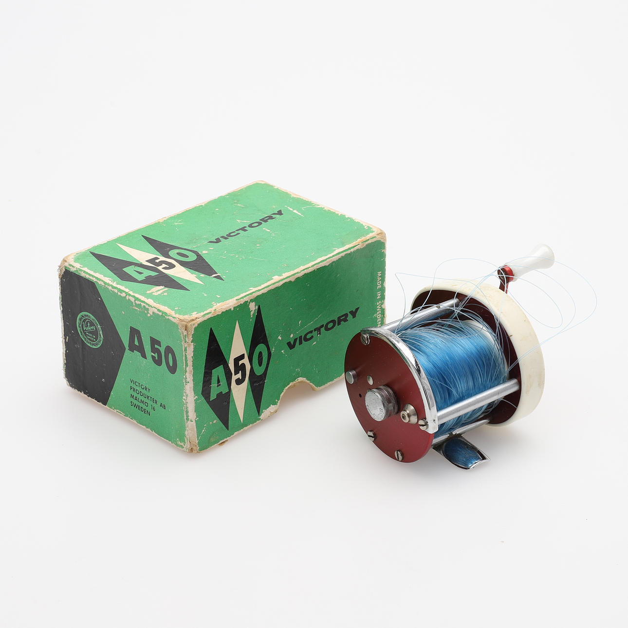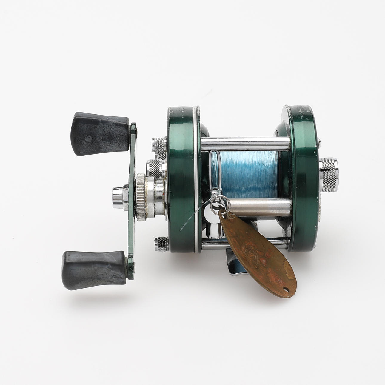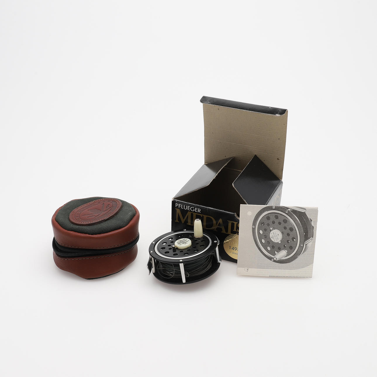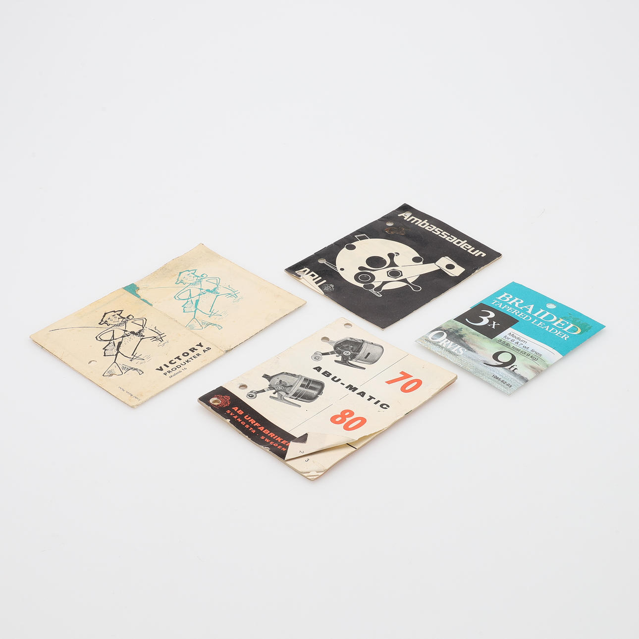 Lederrucksack, inklusive Decke, verschiedenen Broschüren und Rollen, darunter ABU-MATIC 70, Ambassadeur 5000 D und Fliegenrollen und mehr.