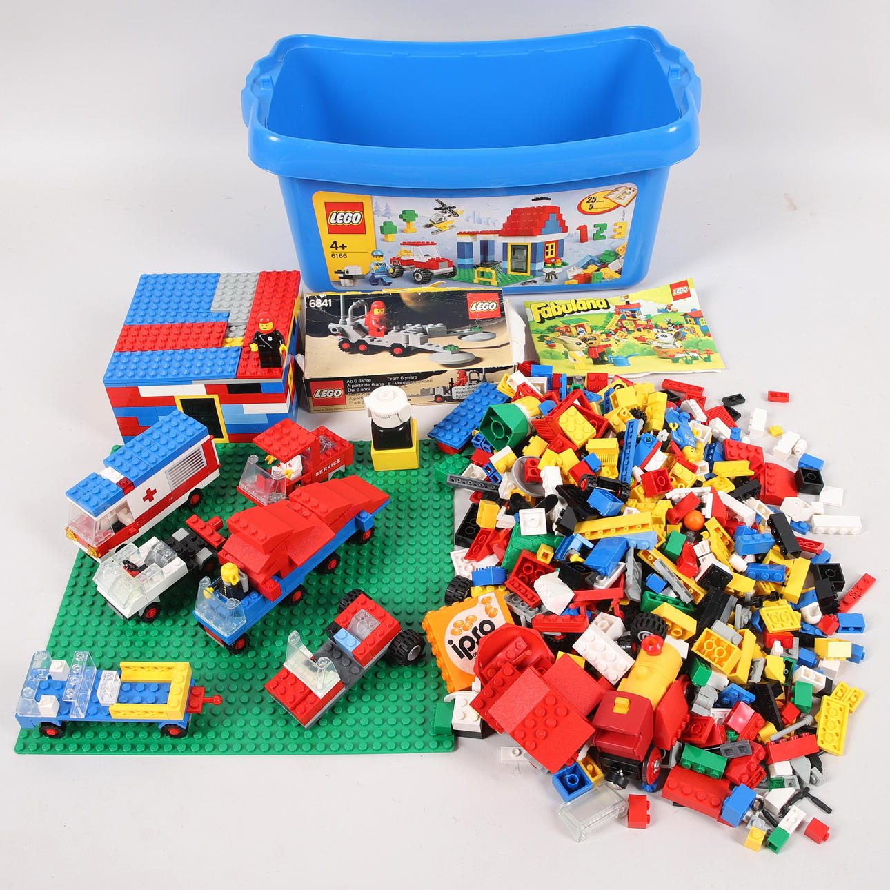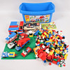 Bauplatte, große, kleine Teile und Beschreibungen in einer LEGO-Box.