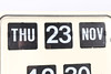Eine batteriebetriebene Bürowanduhr im Stil der Mitte des 20. Jahrhunderts mit Klappfunktion in Weiß mit Quarzwerk. Einzelhandelsaufkleber auf der Rückseite, 977005 MADE IN HONG KONG. 42 cm x 32 cm x 12 cm.