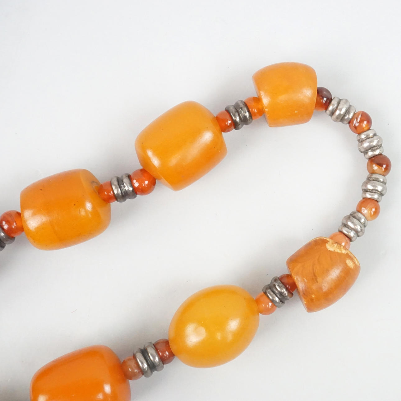 Collier mit Honigbernstein. Länge ca. 70 cm. Perlengröße: Durchmesser ca. 2 cm, Länge ca. 3 cm Gewicht 228 g.