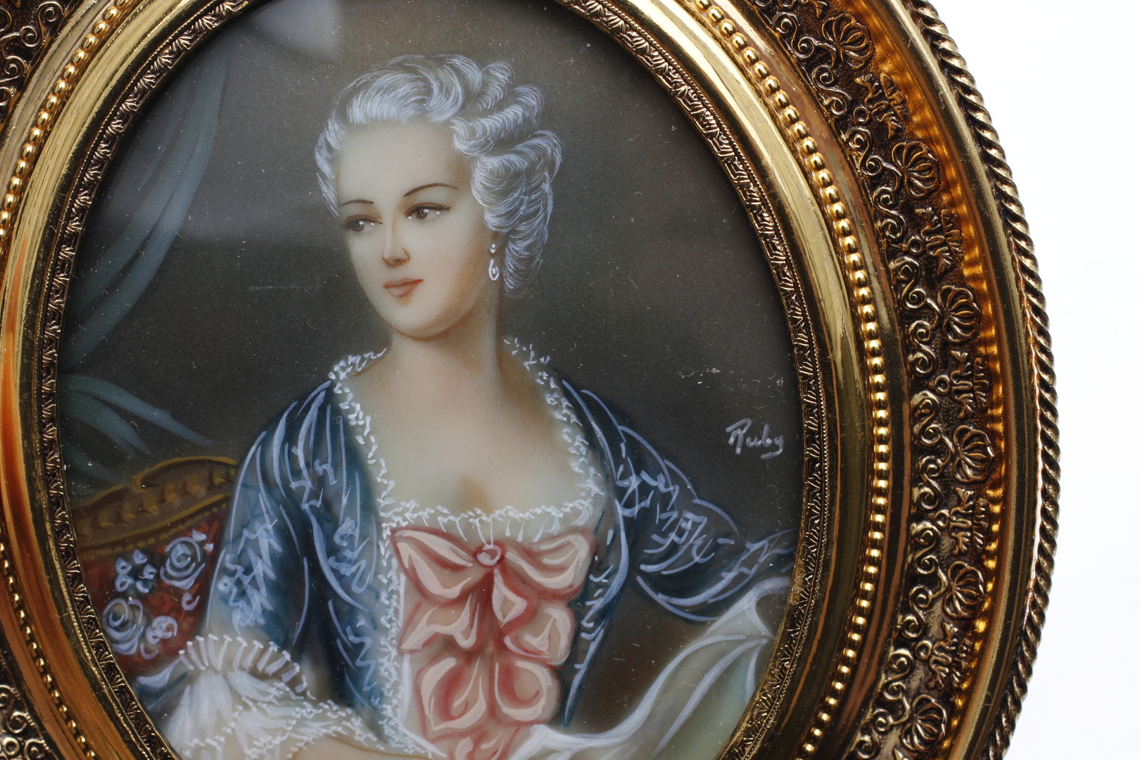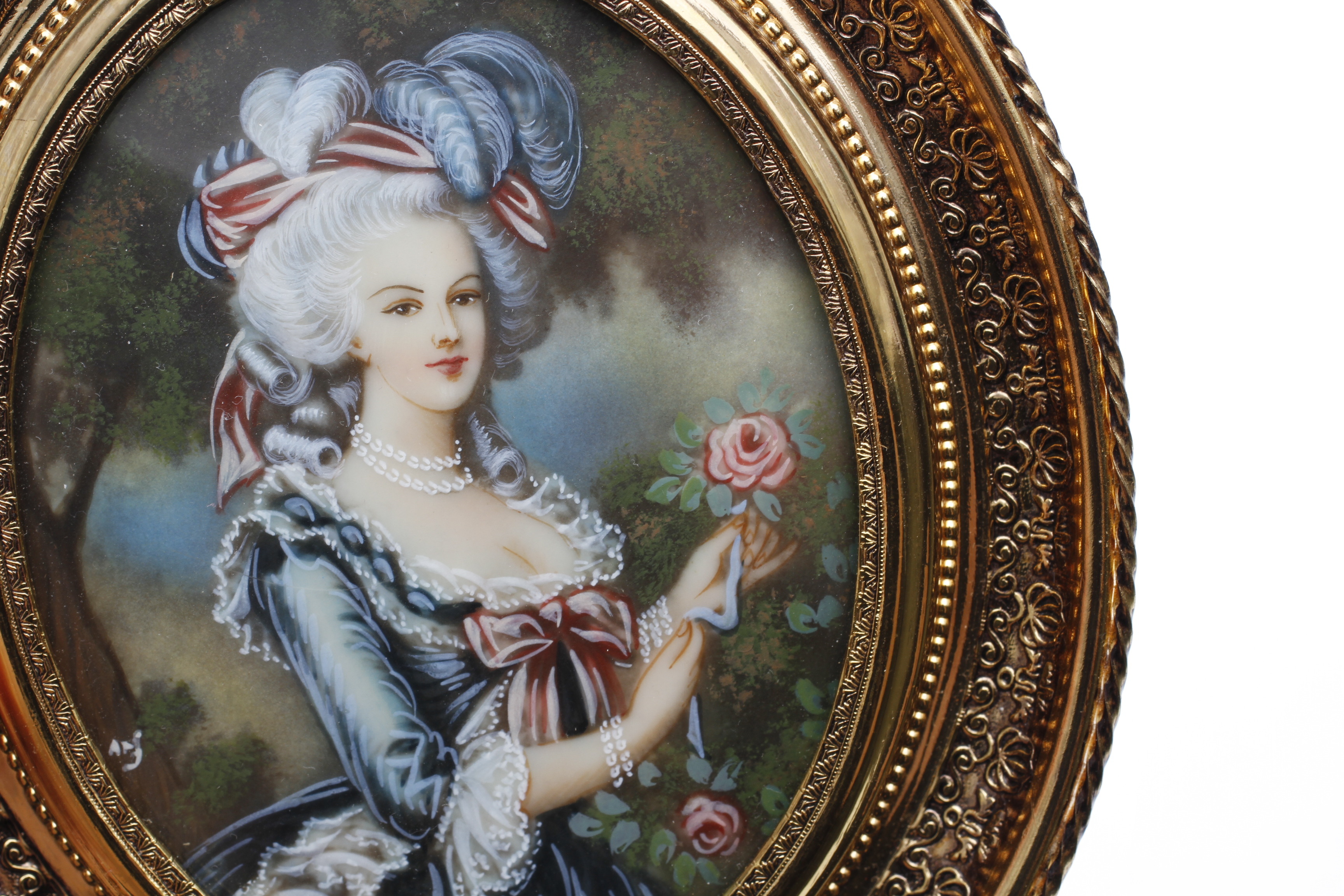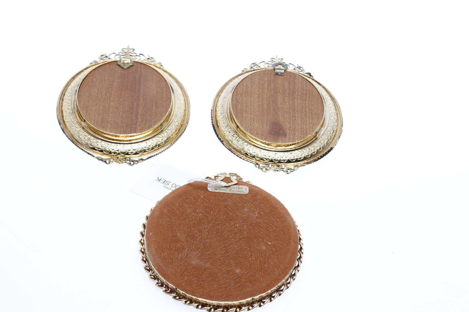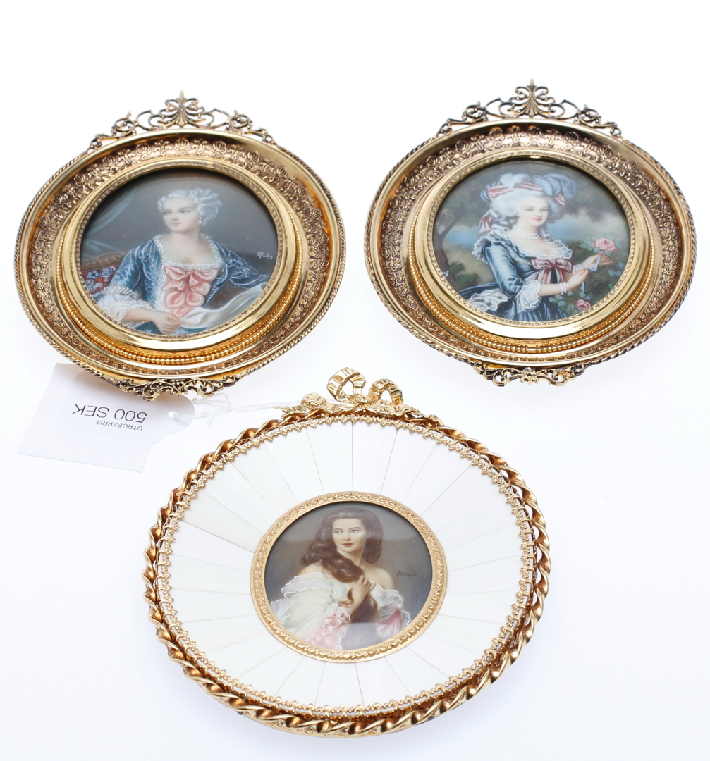 32035. MINIATUREN, 3 Stück, handkolorierte Drucke.