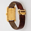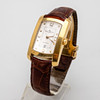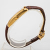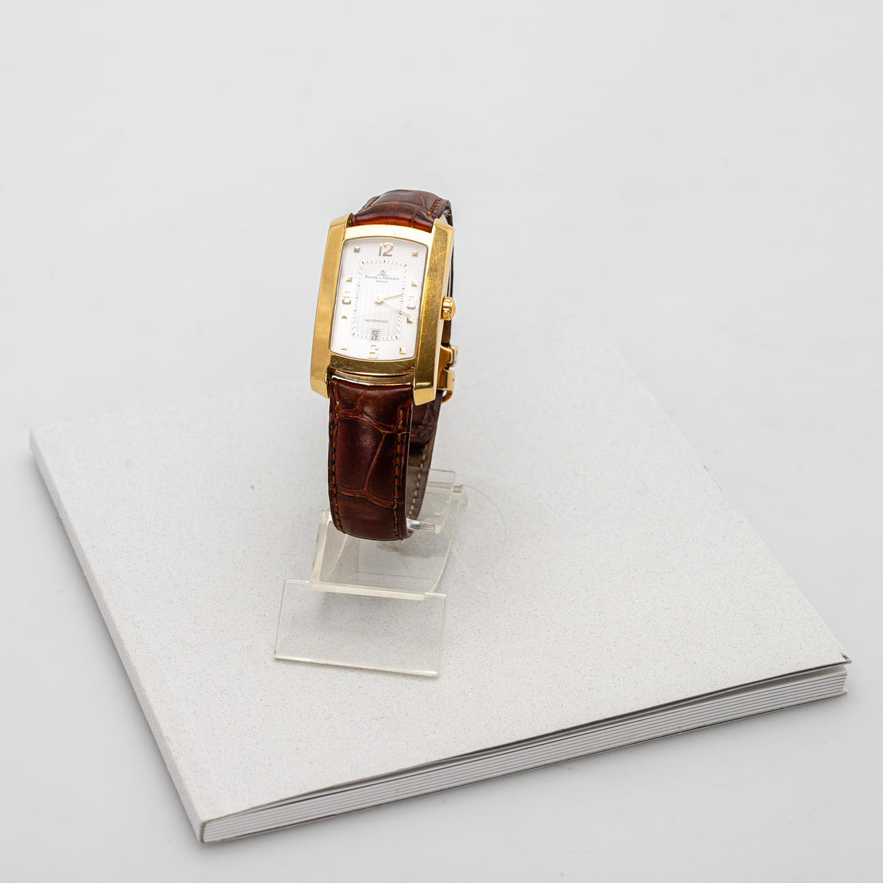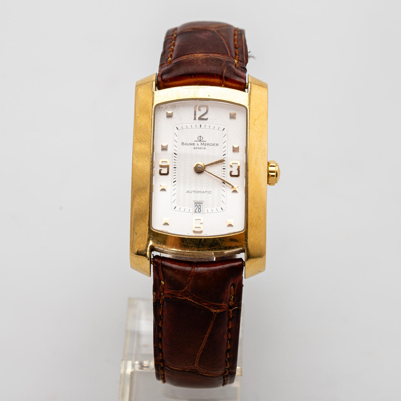Baume & Mercier Armbanduhr, Modell 'Hampton'. Gehäuse gefertigt aus 750er Gold, Zifferblatt mit Minuten- und Stundenzeiger, Datumsanzeige bei '6', automatisches Uhrwerk. Maße ca. Gehäuse 26 mm x 40 mm. Braunes Lederarmband mit Faltschließe. Zum Zeitpunkt der Begutachtung lief die Uhr, Auctionet.com garantiert nicht für die Funktionalität.