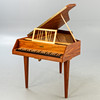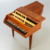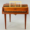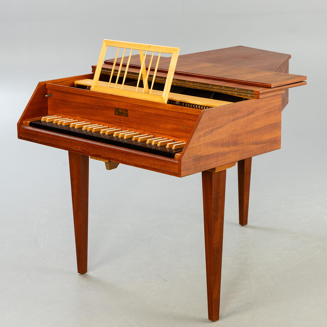 Nussbaum. Auf drei konischen Vierkantbeinen der eckigen Korpus in Flügelform mit geschlossenem Unterboden. Einmanualig. Lautenzug. Firmenbezeichnung auf dem Vorsatzbrett. HxBxT: ca. 83 x 87 x 139 cm.