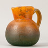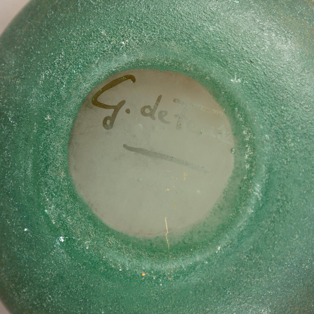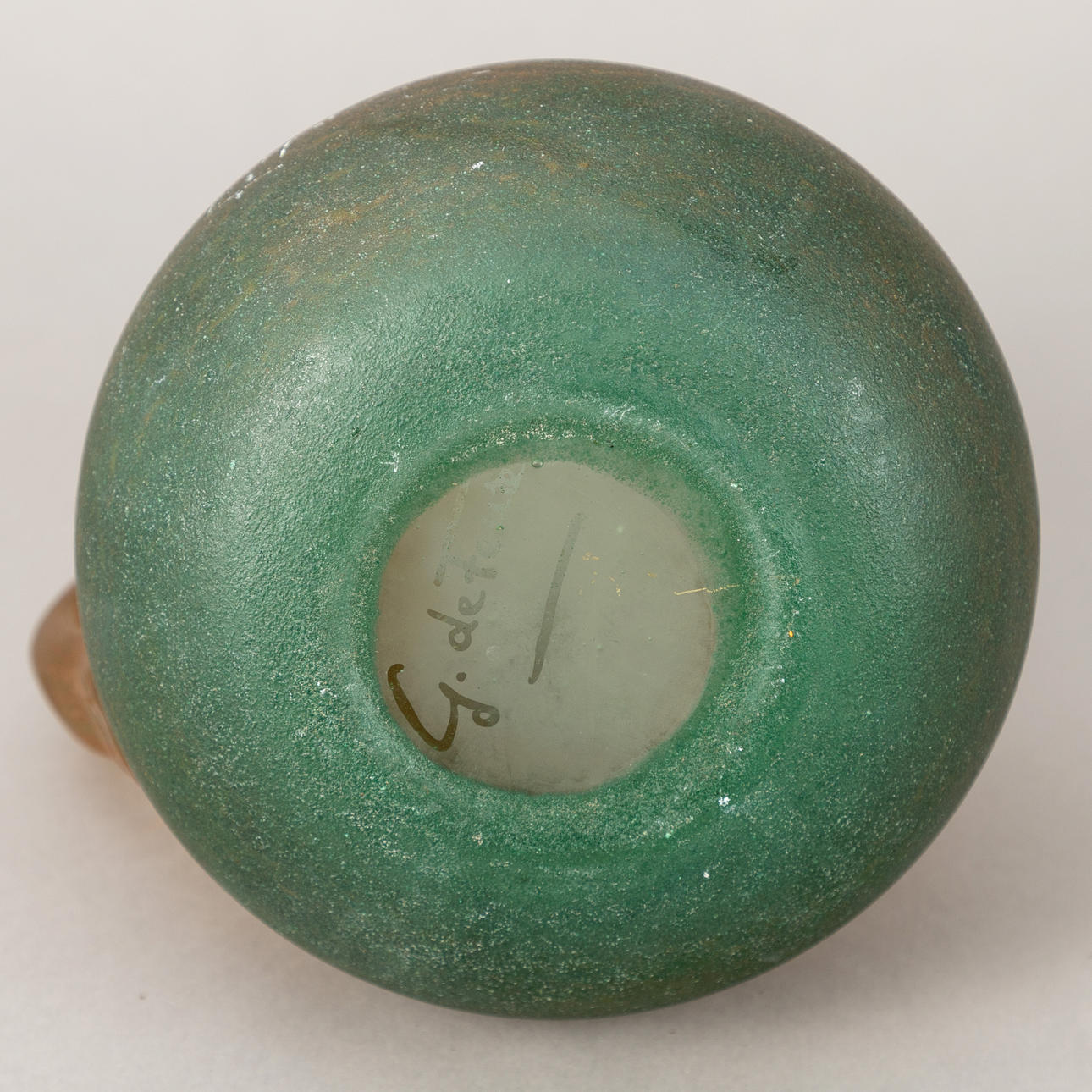 Farbloses Glas mit Pulveraufschmelzungeen in Orange und Grün. Matt geätzte, narbige Oberfläche. Auf der verschliffenen Narbe die geätzte Signatur ´G. de Feure `. H: 17,5 cm.