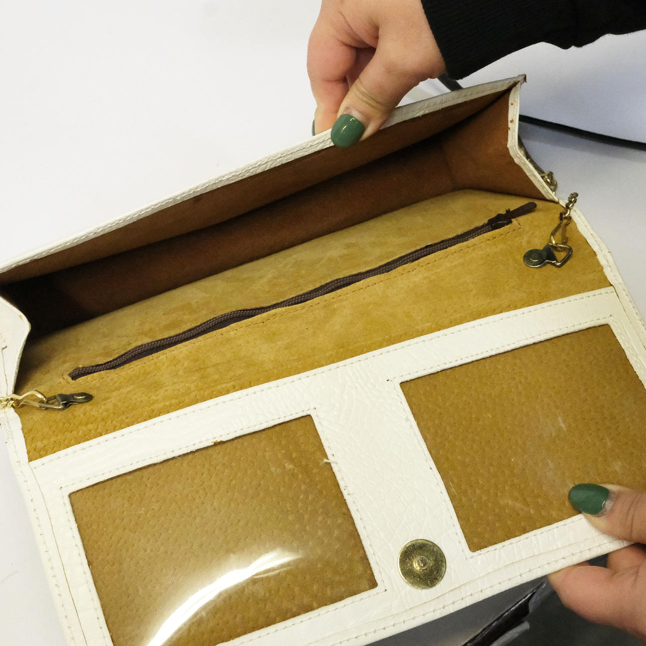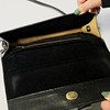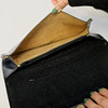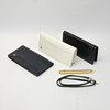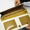 Weiße Tasche, Maße 12x26 cm, schwarze Tasche, Maße 12x24,5 cm, blaue Tasche, Maße 13,5x26 cm, beinhaltet einen schwarzen und einen gelben Metallschultergurt.