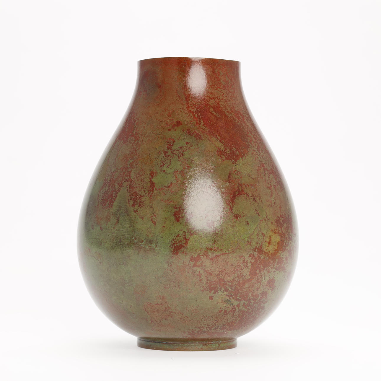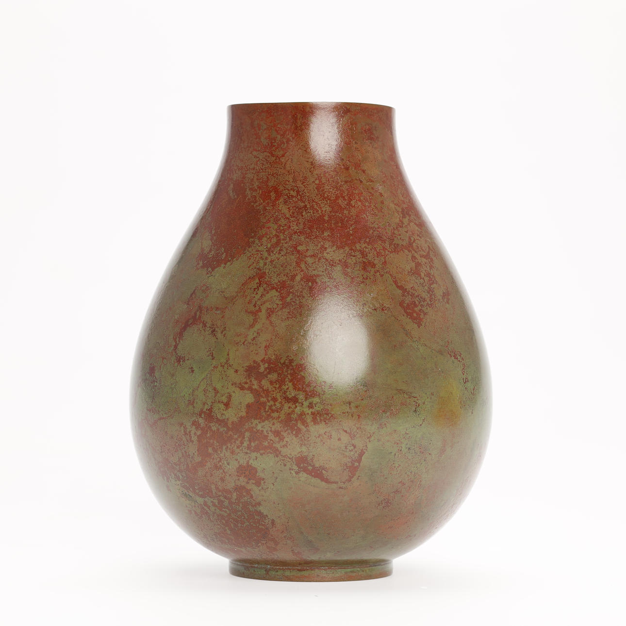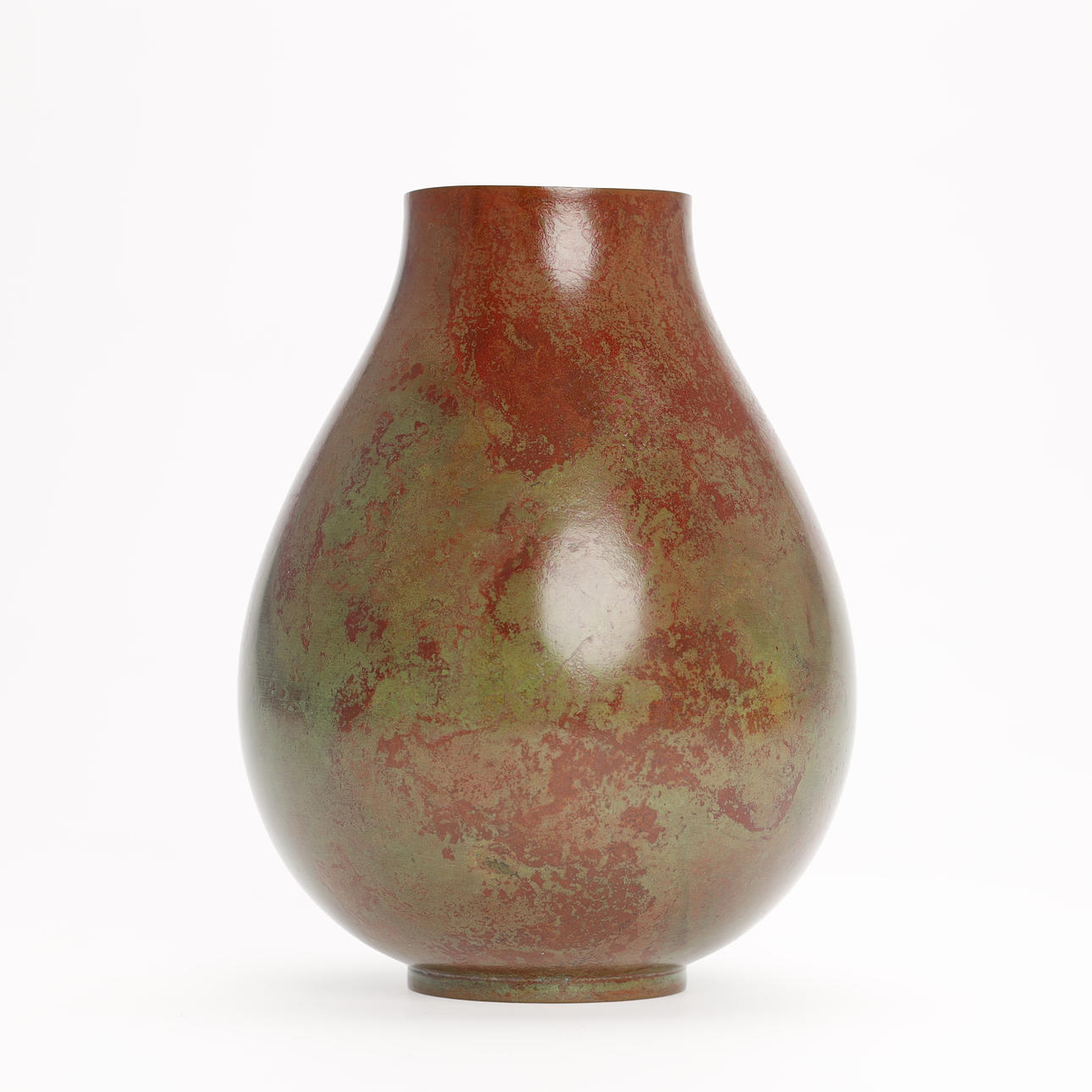Tropfenförmige Bronzevase mit großer runder Öffnung, patiniert kastanienbraun und hellgrün. Mit dem Siegel des Künstlers versehen und mit der originalen Holzkiste geliefert