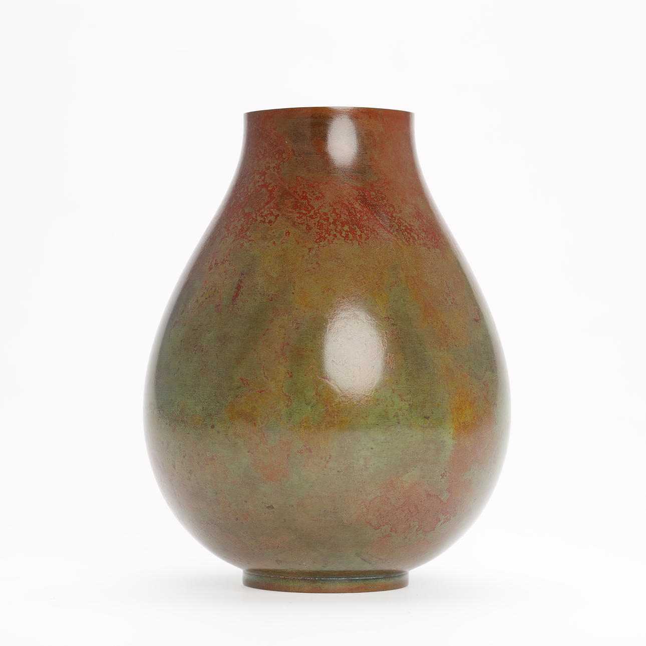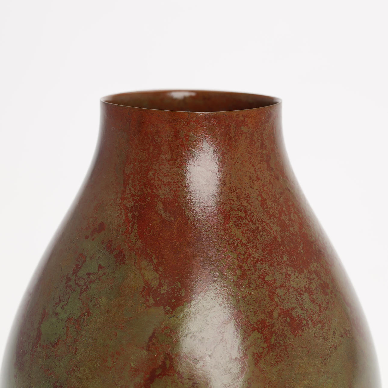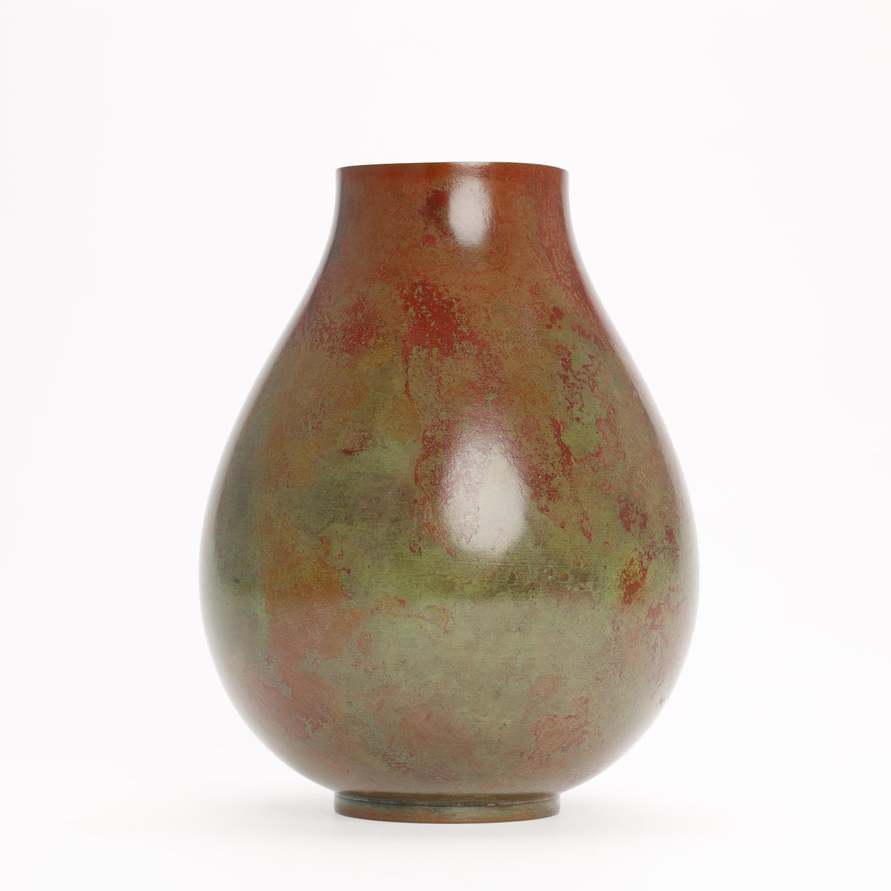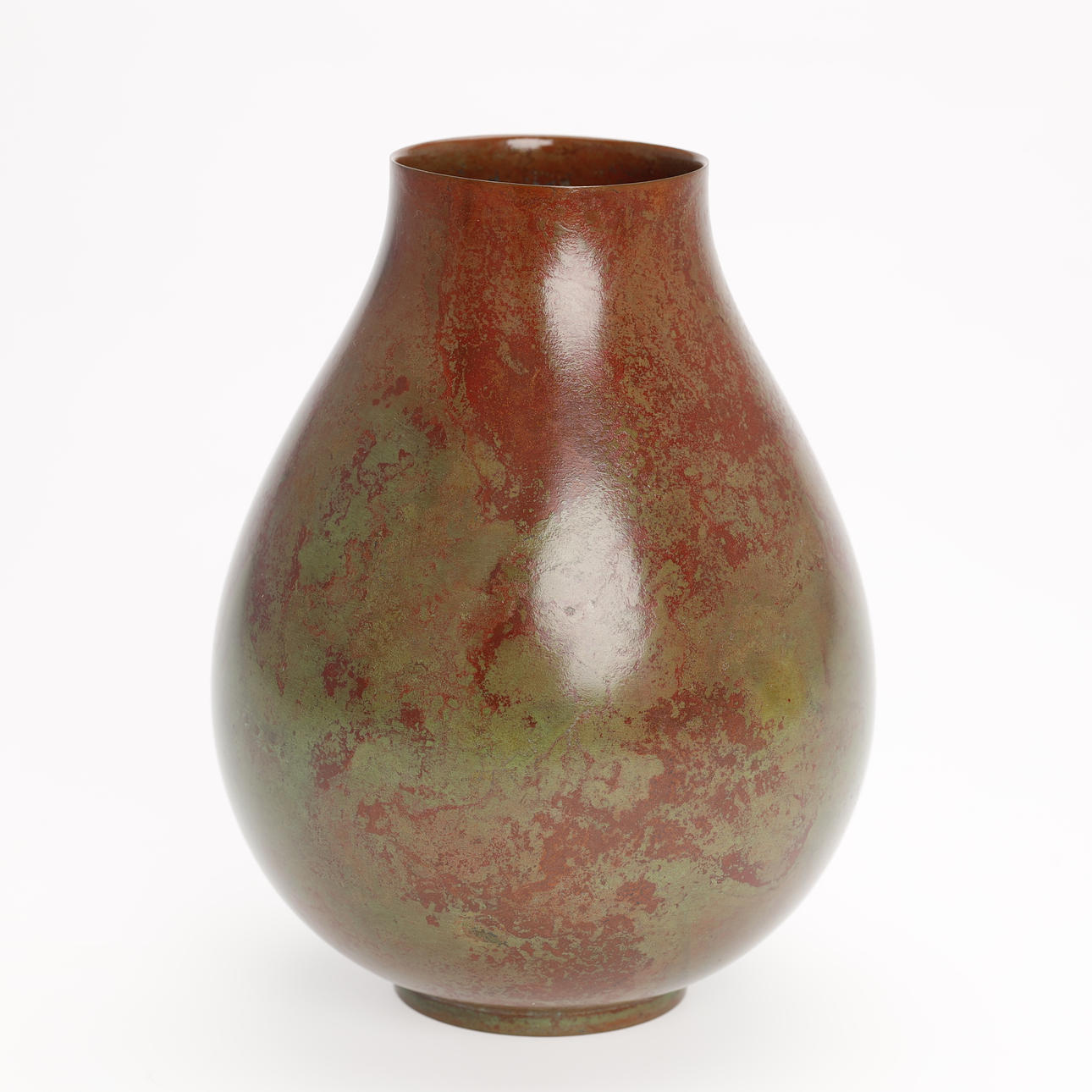 Tropfenförmige Bronzevase mit großer runder Öffnung, patiniert kastanienbraun und hellgrün. Mit dem Siegel des Künstlers versehen und mit der originalen Holzkiste geliefert