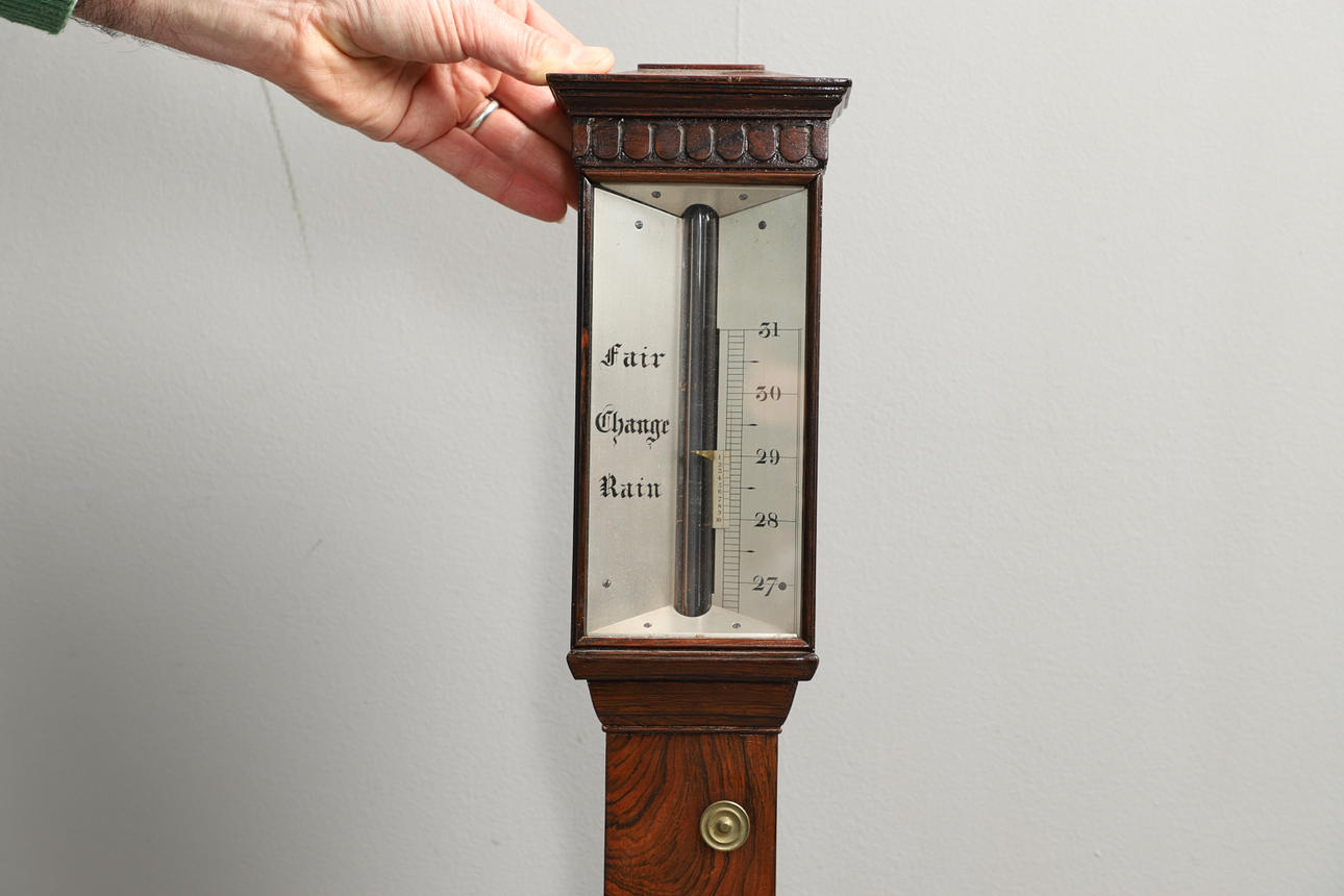 Das Stabbarometer mit versilberten Zifferblättern und Quecksilberthermometer, mit einem geformten Gesims um die Oberseite und einer halbrunden Zisterne. 99 cm hoch