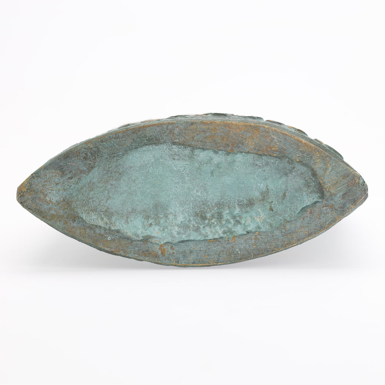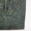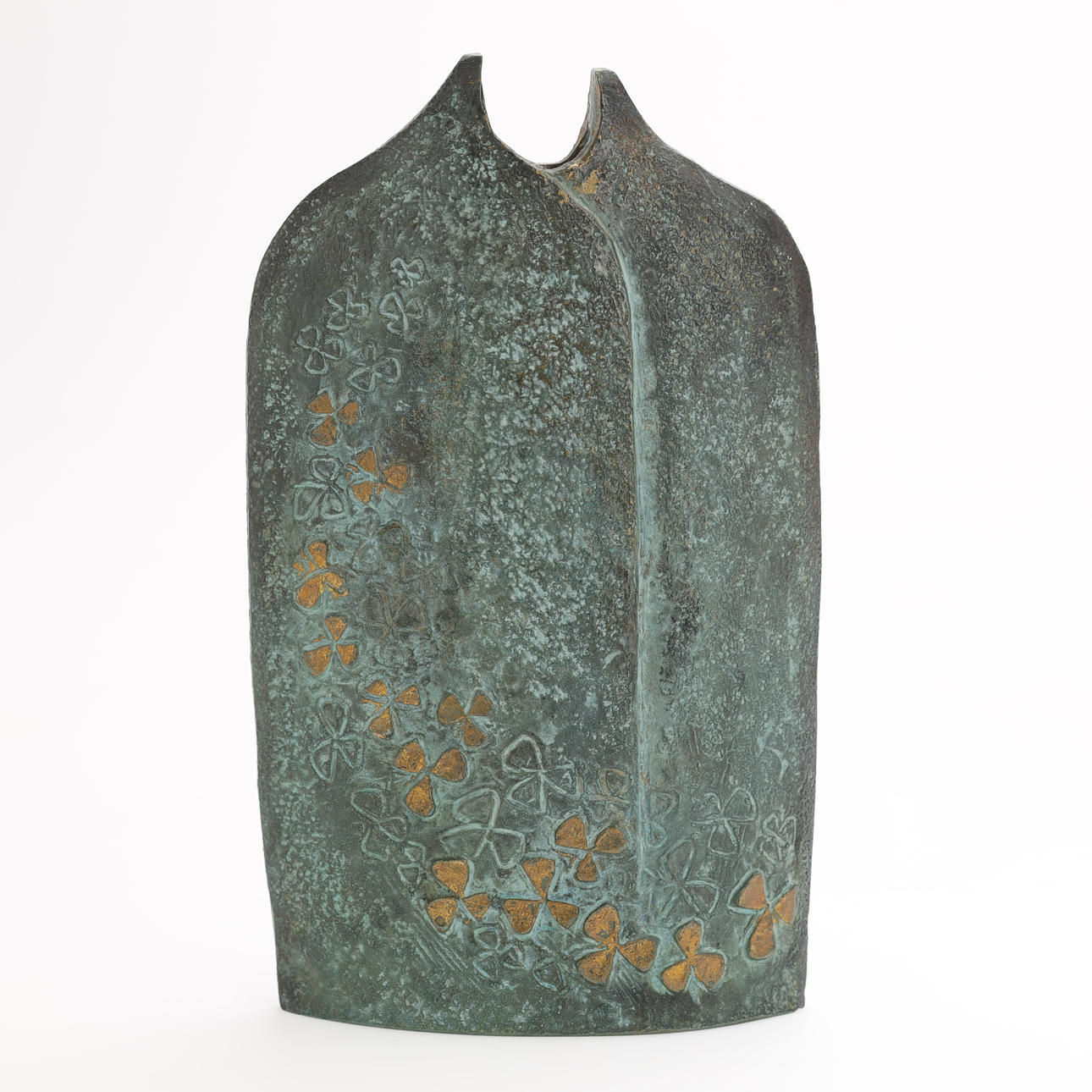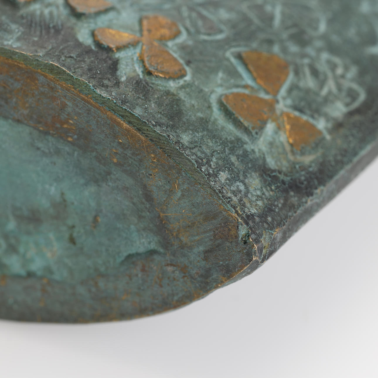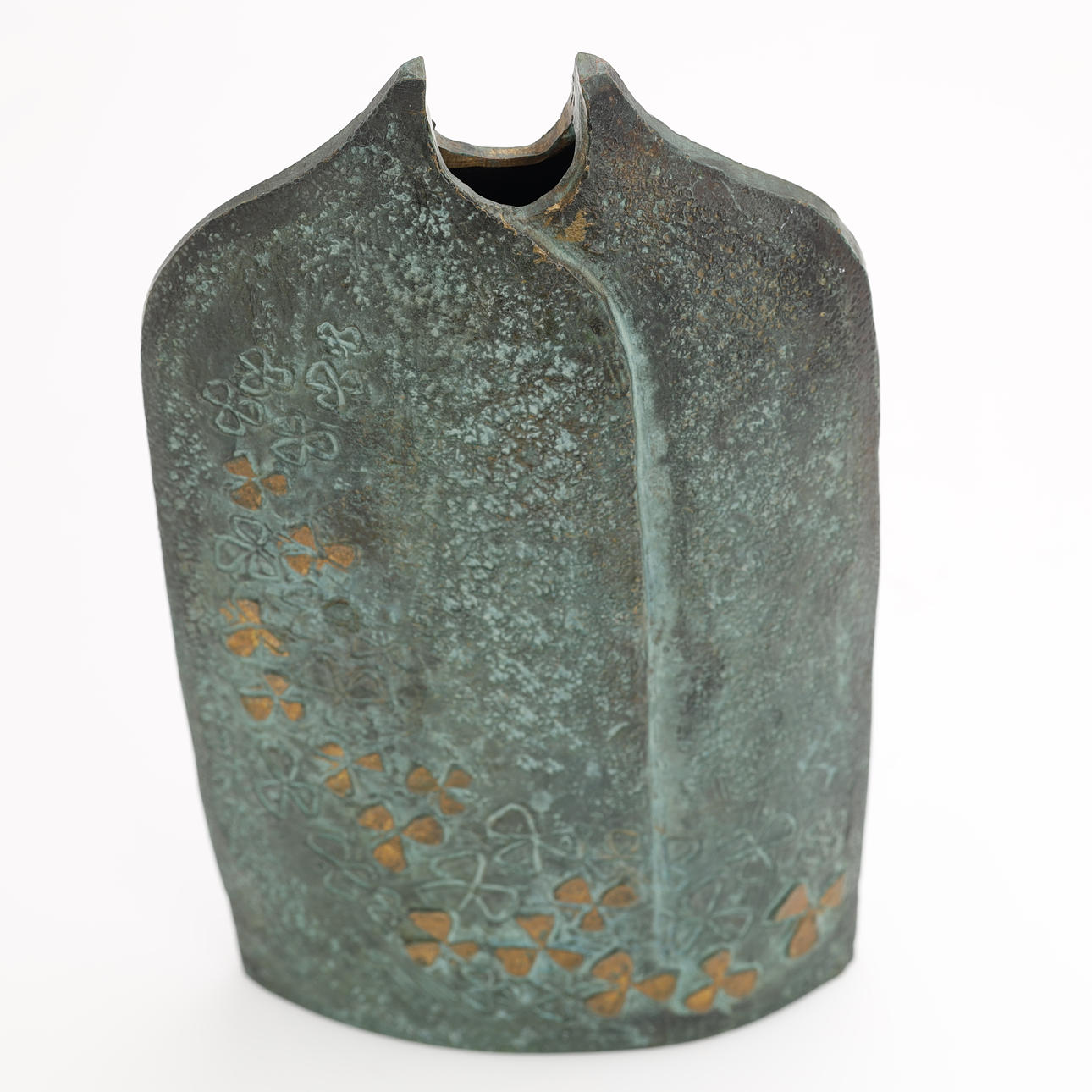 Grüne Bronzevase, verziert mit goldenen Blumenmotiven. Flacher Körper mit asymmetrischer Öffnung. Künstler: Murata Hiroshi. Verschlagwortet mit dem Siegel des Künstlers.