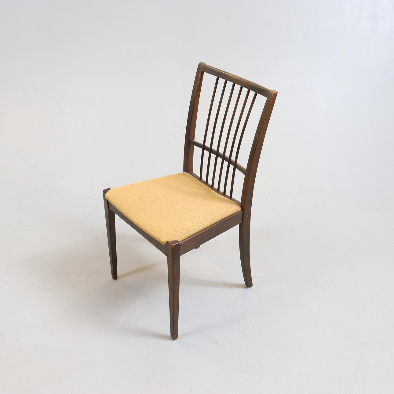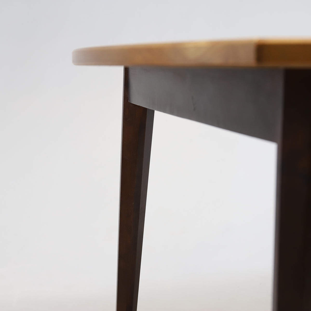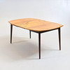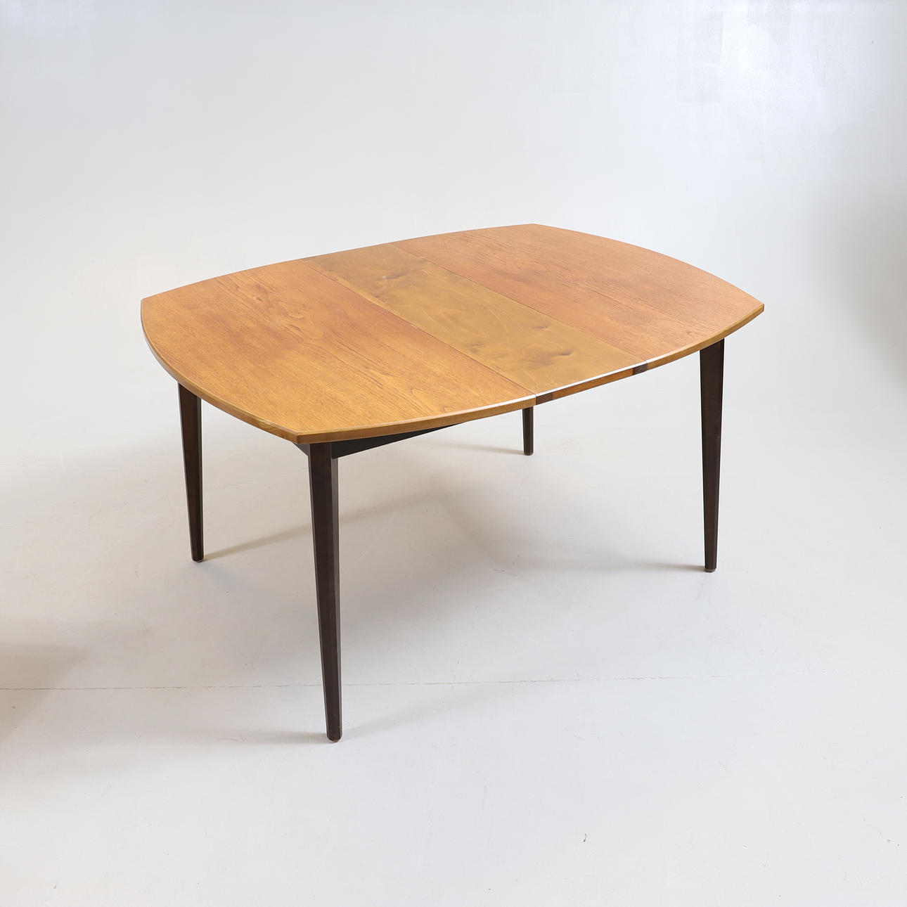 Tisch mit fünf Stühlen. Tisch mit zwei Einlegeplatten a 27,5 cm. Geschwärzte Beine und Unterbau. SMI markiert mit den Nummern 315 und 385. Länge ca. 105 cm. Breite ca. 104 cm Höhe ca. 72 cm Stühle mit lockerer Bestuhlung. Rückenhöhe ca. 85 cm.