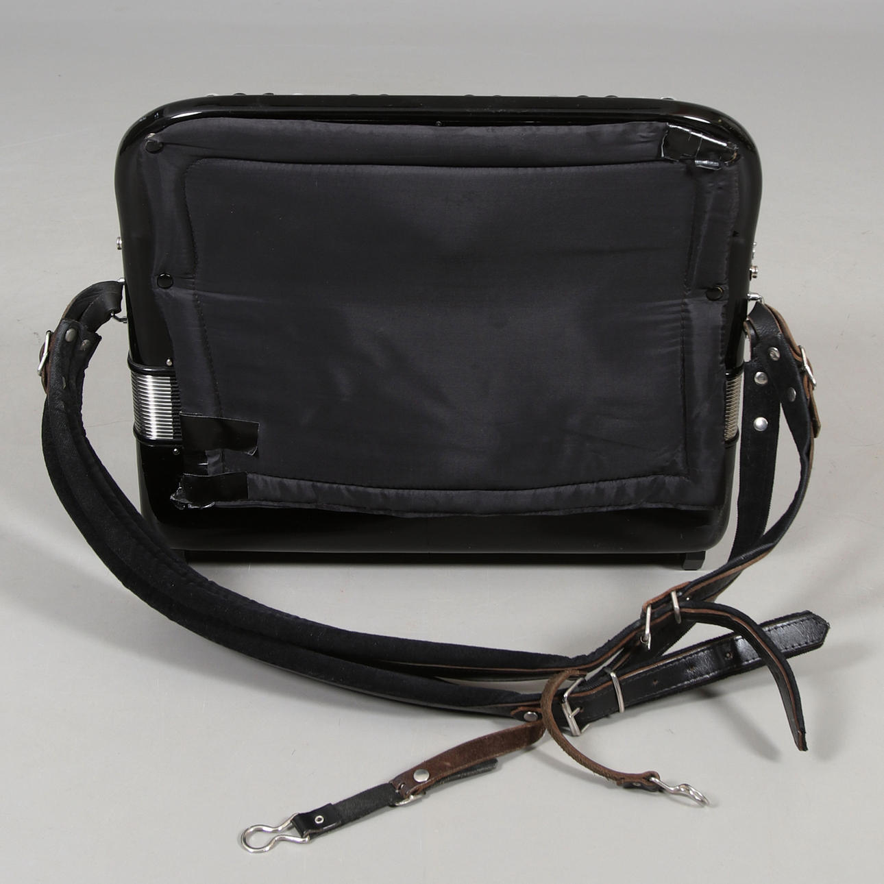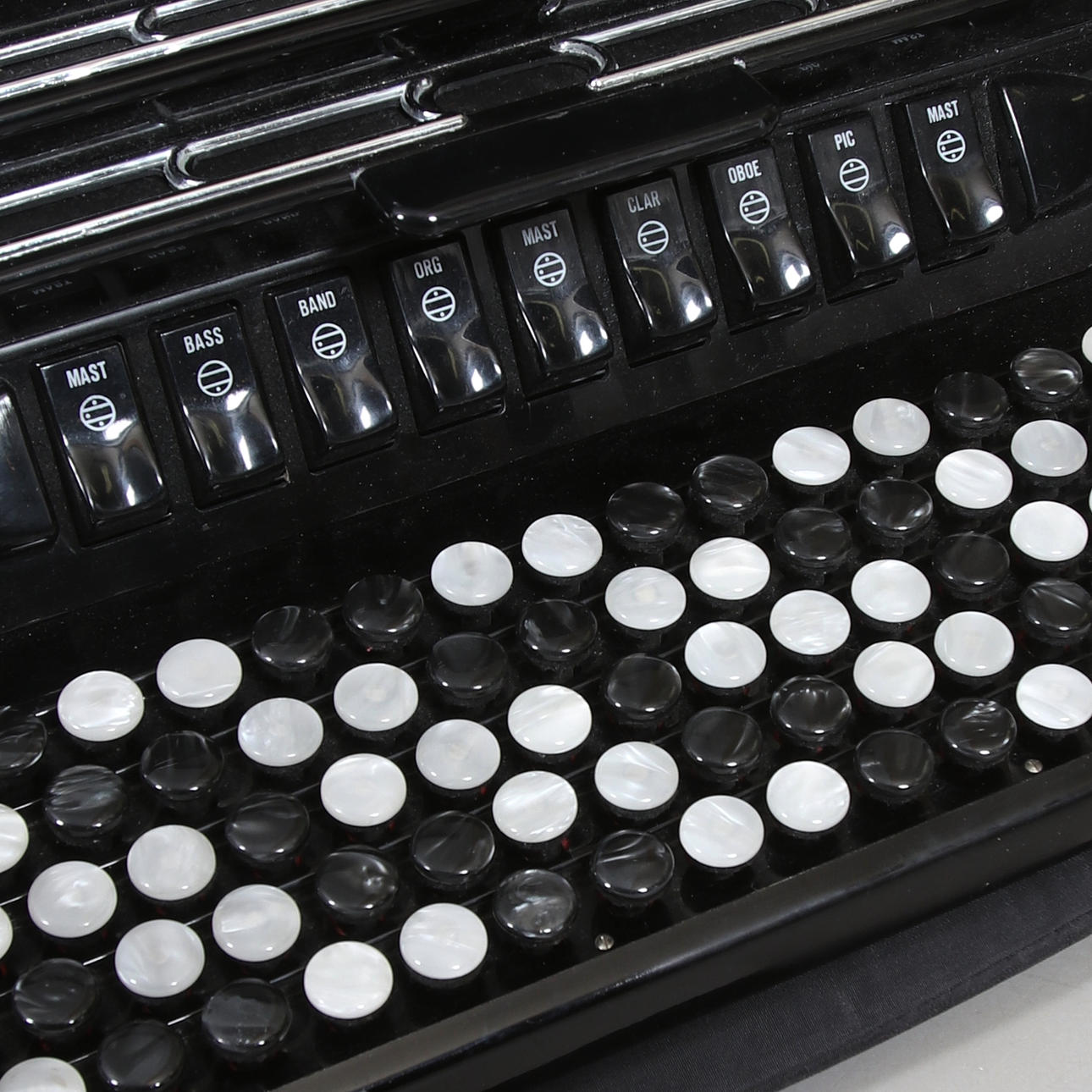9 Register im Diskant, 5 Reihen. 3 Register und 120 Tasten in der Basis. Länge 42, 21, Höhe 49 cm.