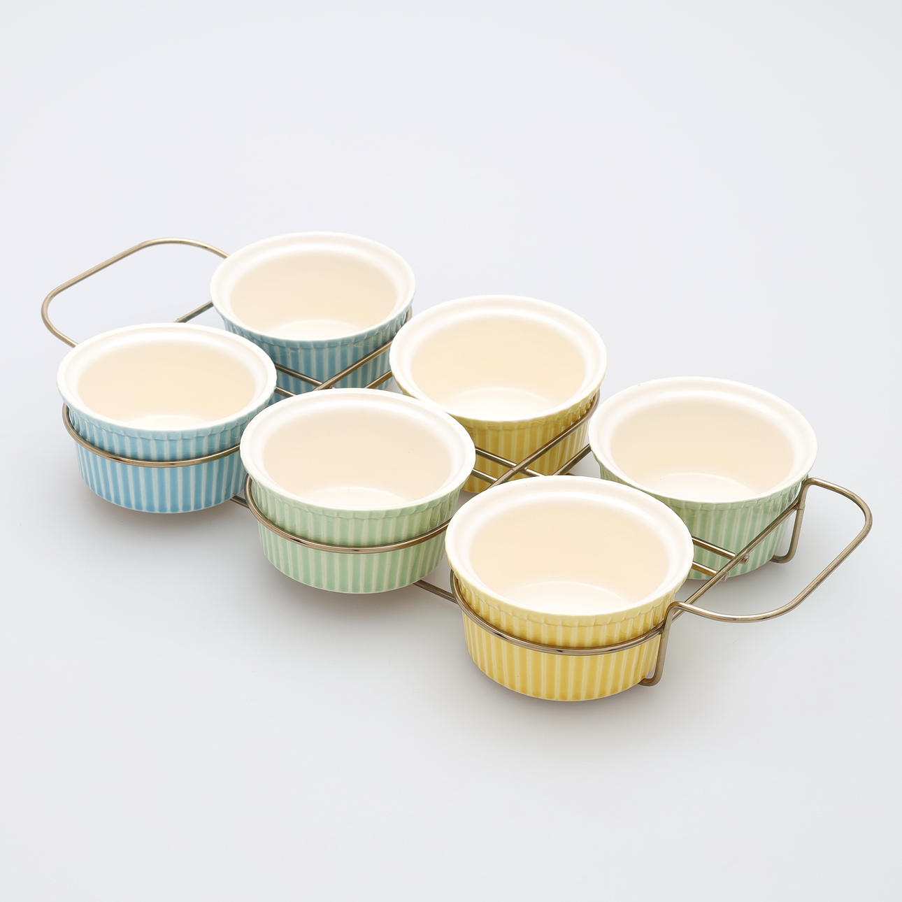 Set aus Messing mit sechs Porzellanformen.