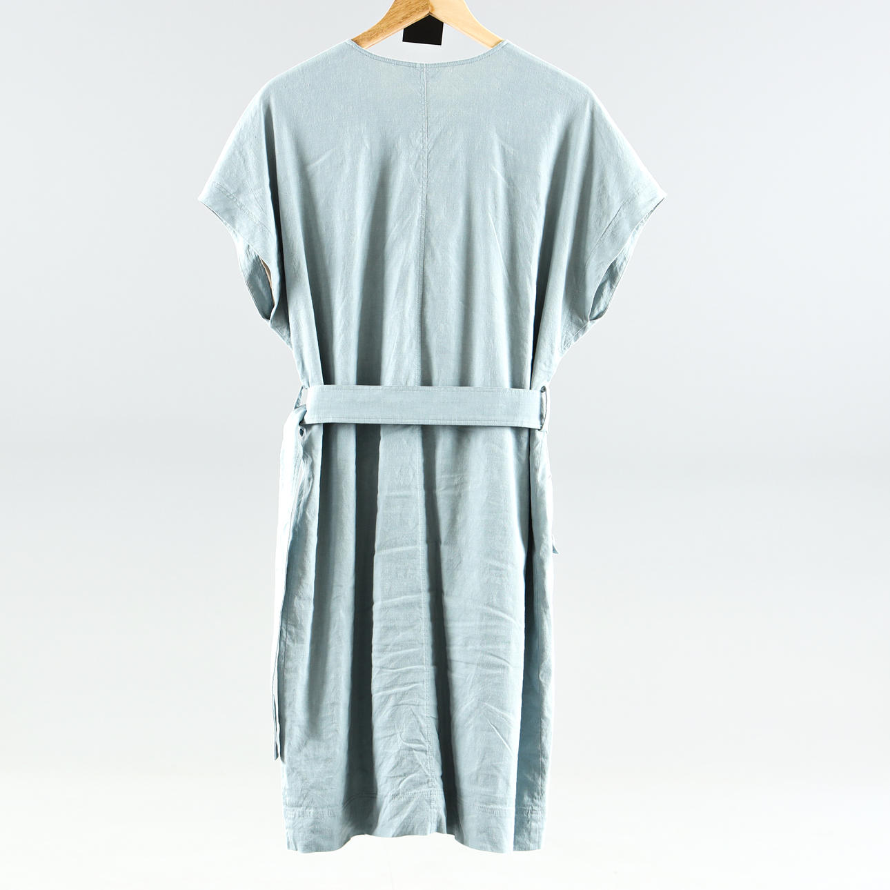 Kurzärmliges Kleid aus Leinenmix, Innenfutter aus beigem Baumwollmix. Brusttasche und Handverschlussklappe mit Druckknöpfen. Abnehmbarer Gürtel an der Taille. Größe UK12 entspricht EU 40. Brustweite 110 cm, Rückenlänge 100 cm.