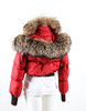 Jacke mit kurzem Bund aus rotem Polyester, Daunenfüllung. Abnehmbarer Kapuschong mit Kojotenkrempe. Rückenlänge ca. 45 cm Brustweite ca. 90 cm.